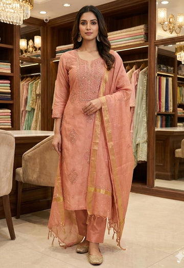 Description: Elevate your ethnic wardrobe with this Peach & Greyish Mal Chanderi Chikankari Suit for...
