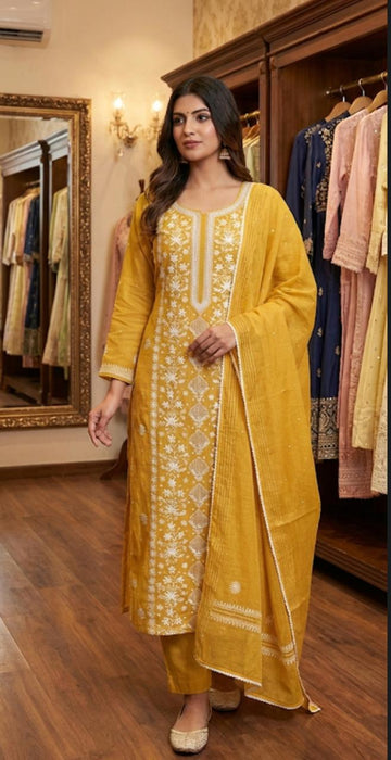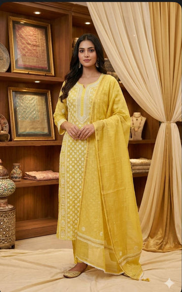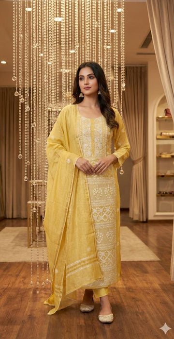 Description: Elevate your ethnic wardrobe with this Graceful Yellow & Onion Pink Chikankari Linen Suit...