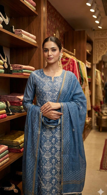 Description: Elevate your ethnic wardrobe with this Stone Blue Mal-Chanderi Chikankari Suit for Women, expertly...