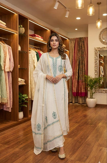 Description: Elevate your ethnic wardrobe with this Pure Ivory Chanderi Chikankari Suit for Women, meticulously...