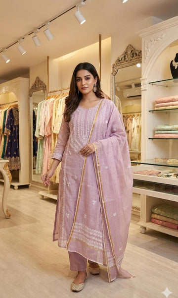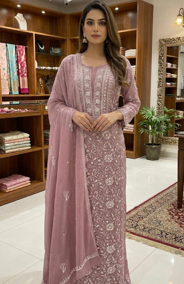 Description: Buy Chikankari suits online and experience timeless elegance with this Rose Pink Tissue Chikankari...