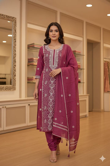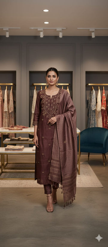 Description: Elevate your ethnic wardrobe with this stunning 3-piece silk suit in a rich carbon...