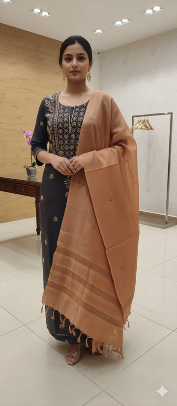 Description: A graceful Tissue unstitch suit featuring a beautifully designed neckline with paisley motifs and...