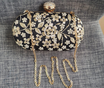 This Exquisite light grey silk Lucknowi chikankari clutch adorned with intricate Zari work is the...