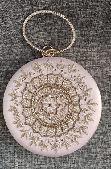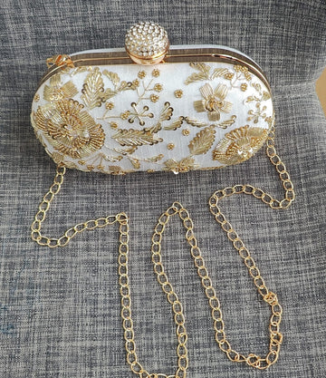 This Exquisite fawn silk Lucknowi chikankari clutch adorned with intricate Zari work is the epitome...