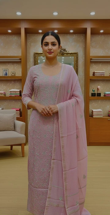 Aaparya Hand Embroidered Dusky Rose Mul Chanderi Lucknowi Chikankari Semi-Stich Kurta Dupatta