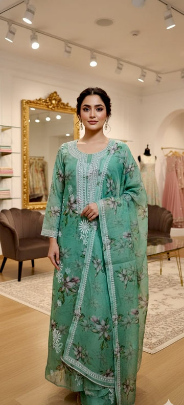 Description: This Printed Sea Green Organza Kurta looks premium with the white thread embroidery. It...