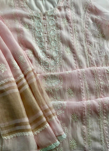 Description: Graceful Baby Pink kurta set with beautiful neckline & front panel *Daraj work on...