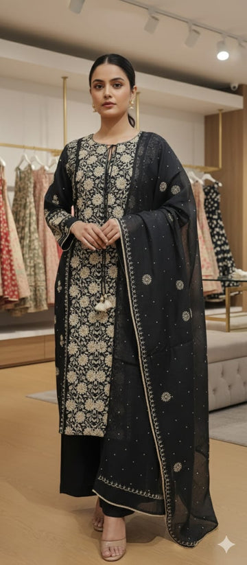 Description: This Semi-Stitched Nayara Cut unstitched Kurta Dupatta set is designed with white pearls &...