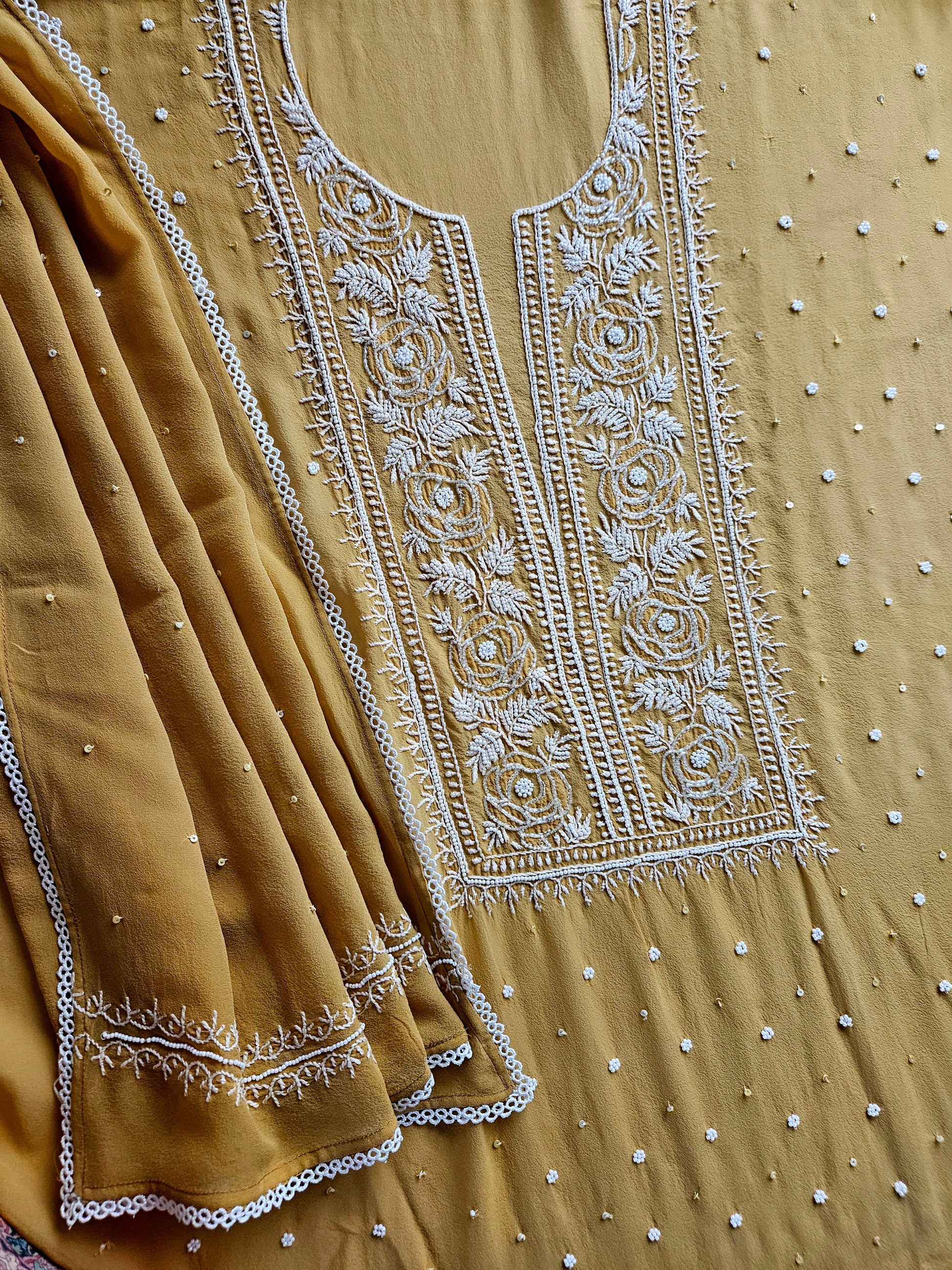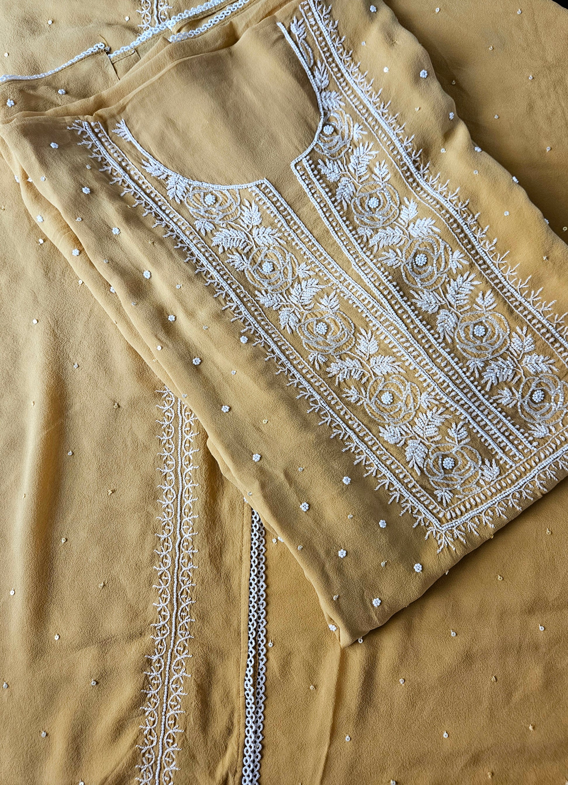 - Chikankari Kurta with a neckline and a broad sleeves border.