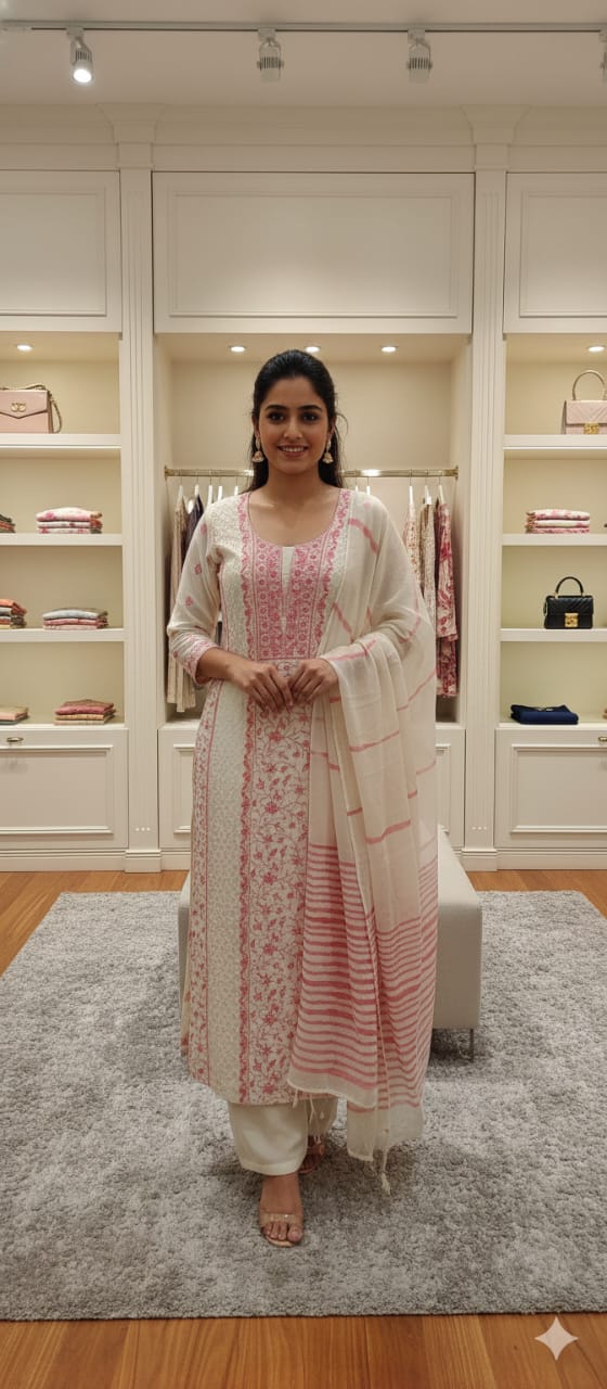 This exquisite 3-piece Tussar silk suit in a graceful ivory hue is beautifully crafted with full jaal pink thread embroidery, creating a soft yet striking contrast. The kurta features delicate jaali work on the neckline, adding refined elegance to the design. Paired with a pure chiffon dupatta adorned with intricate crochet lace, this ensemble reflects timeless charm and artisanal beauty—perfect for festive celebrations and special occasions.