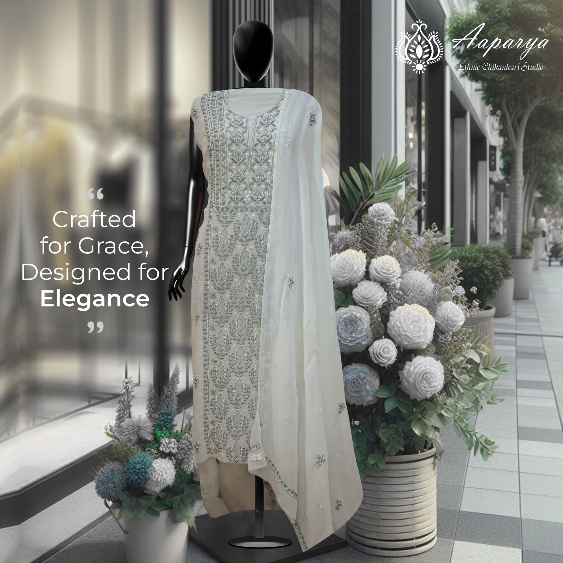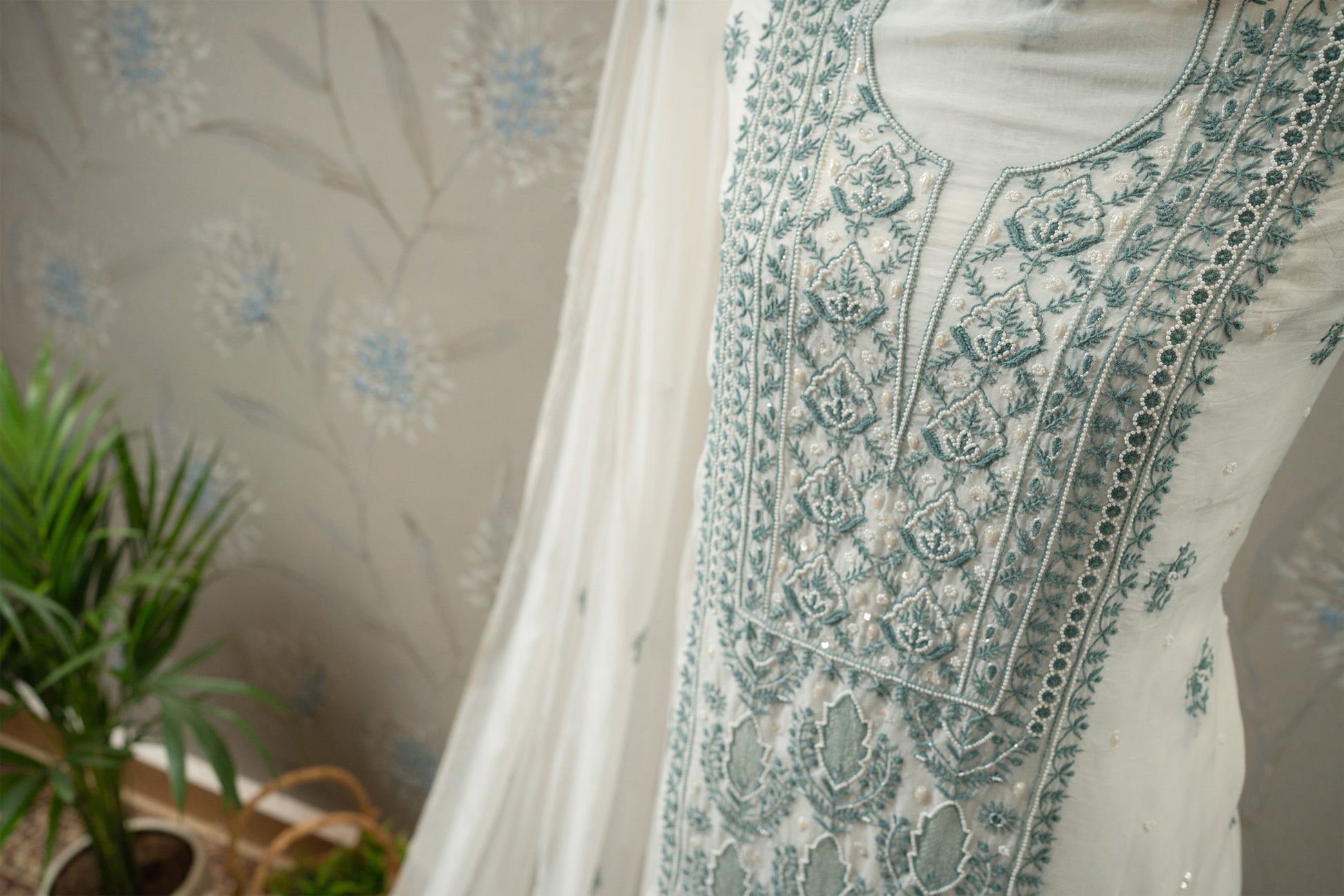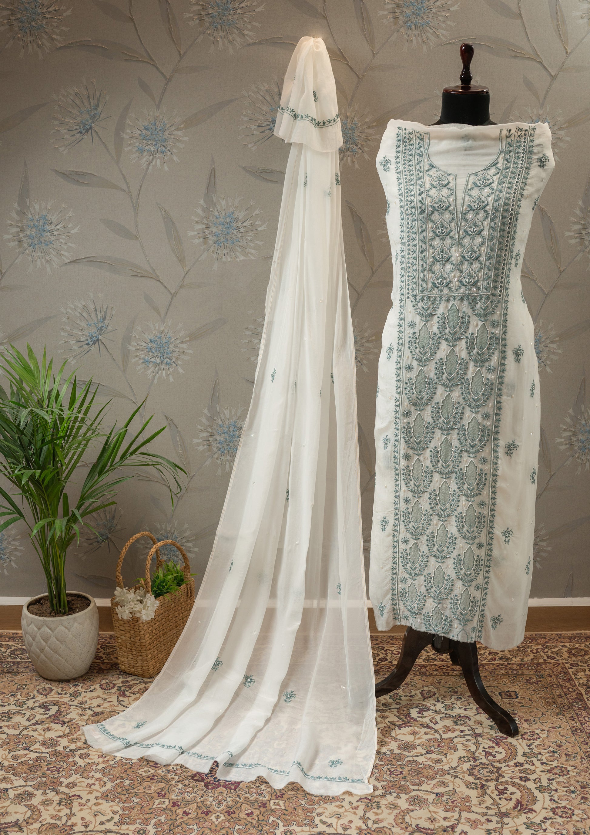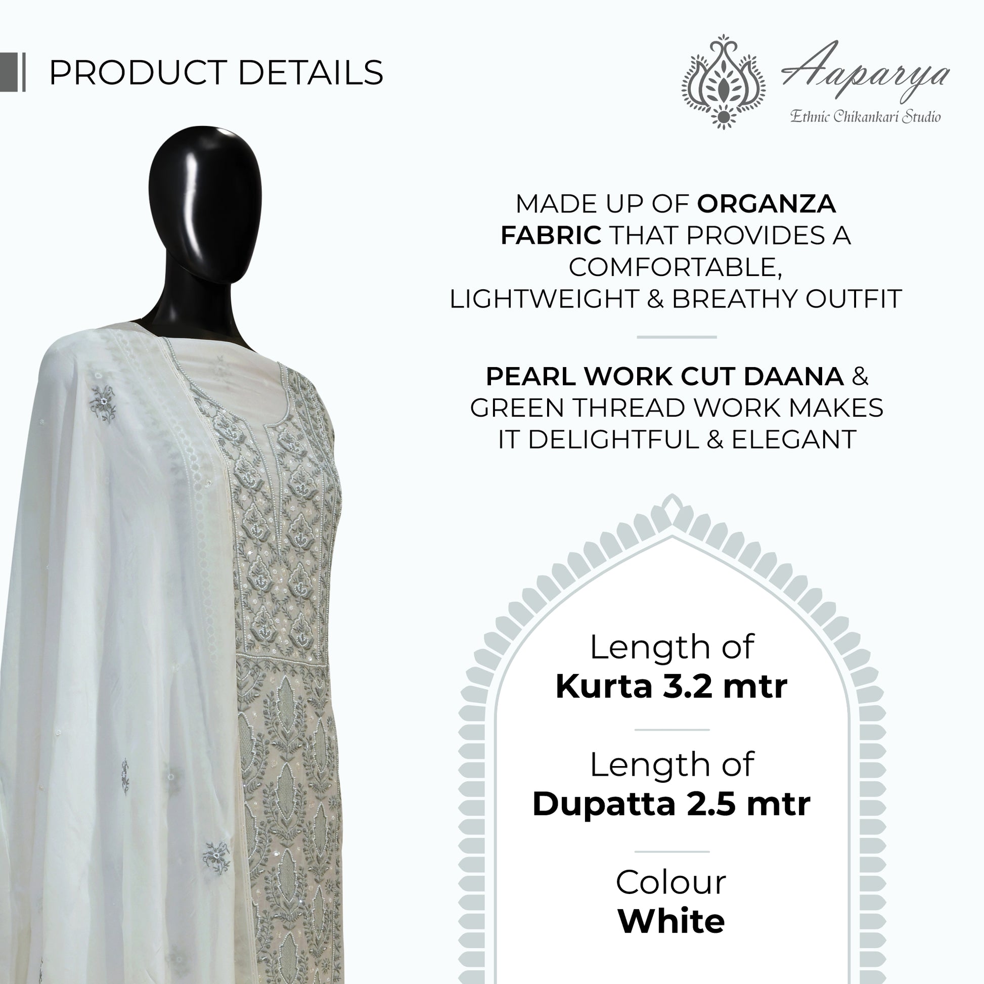This unstitched Suit is made up of Organza Fabric that provides a comfortable, lightweight and breathy outfit. The white colour of this attire will never fail to give you a refreshing look. The pearl work cut-danna and green thread work makes it delightful and elegant. A perfect addition to your wardrobe.