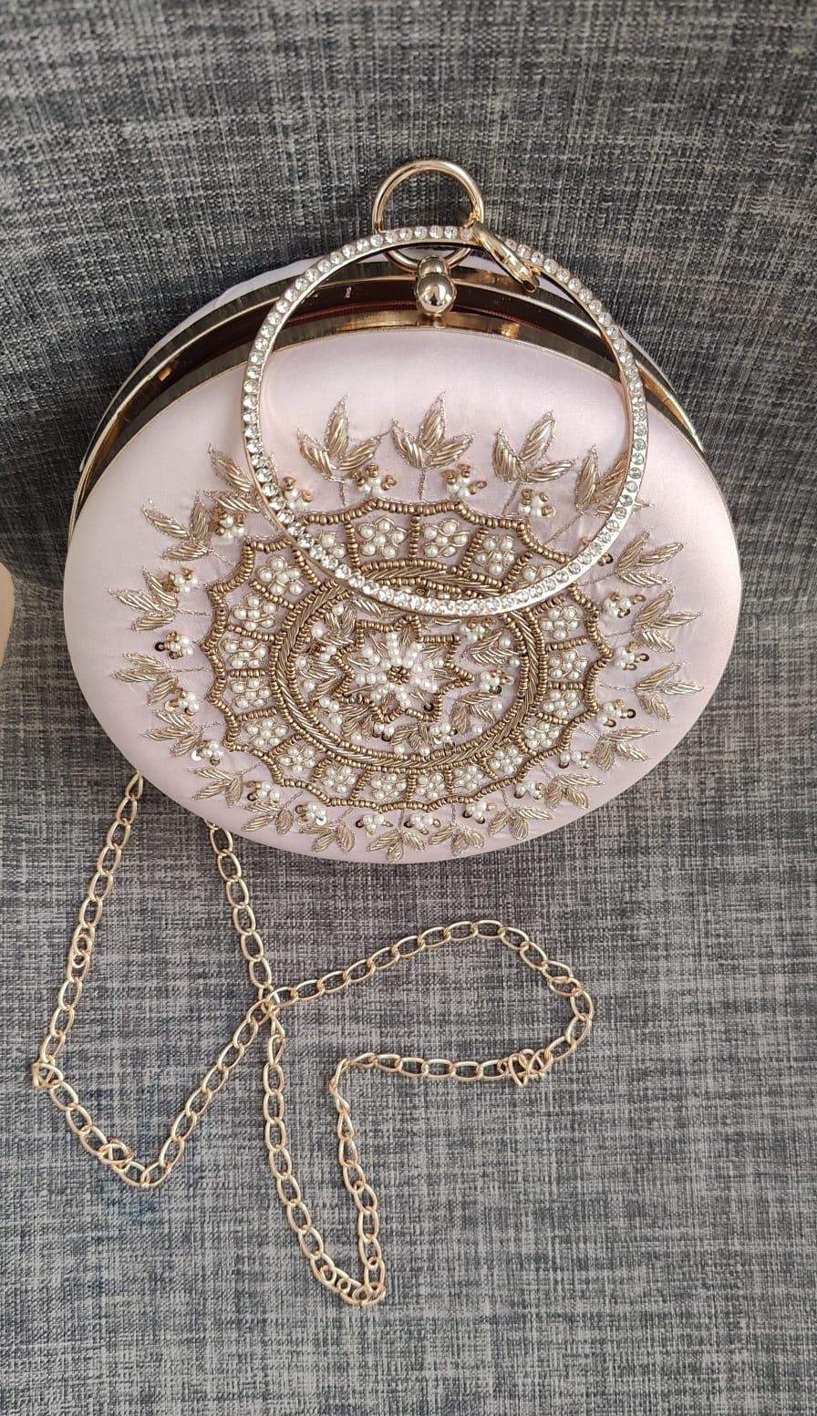 This Pink Silk Clutch blends traditional craftsmanship with contemporary elegance. Designed with a radiant silk texture, it features a mesmerizing play of fabric and detailing. Accented with a diamond-stone metal clasp and a detachable chain sling, it is lightweight and easy to carry. Spacious enough to fit phones of almost all sizes, this clutch is a perfect accessory for weddings, festive celebrations, and special occasions.
