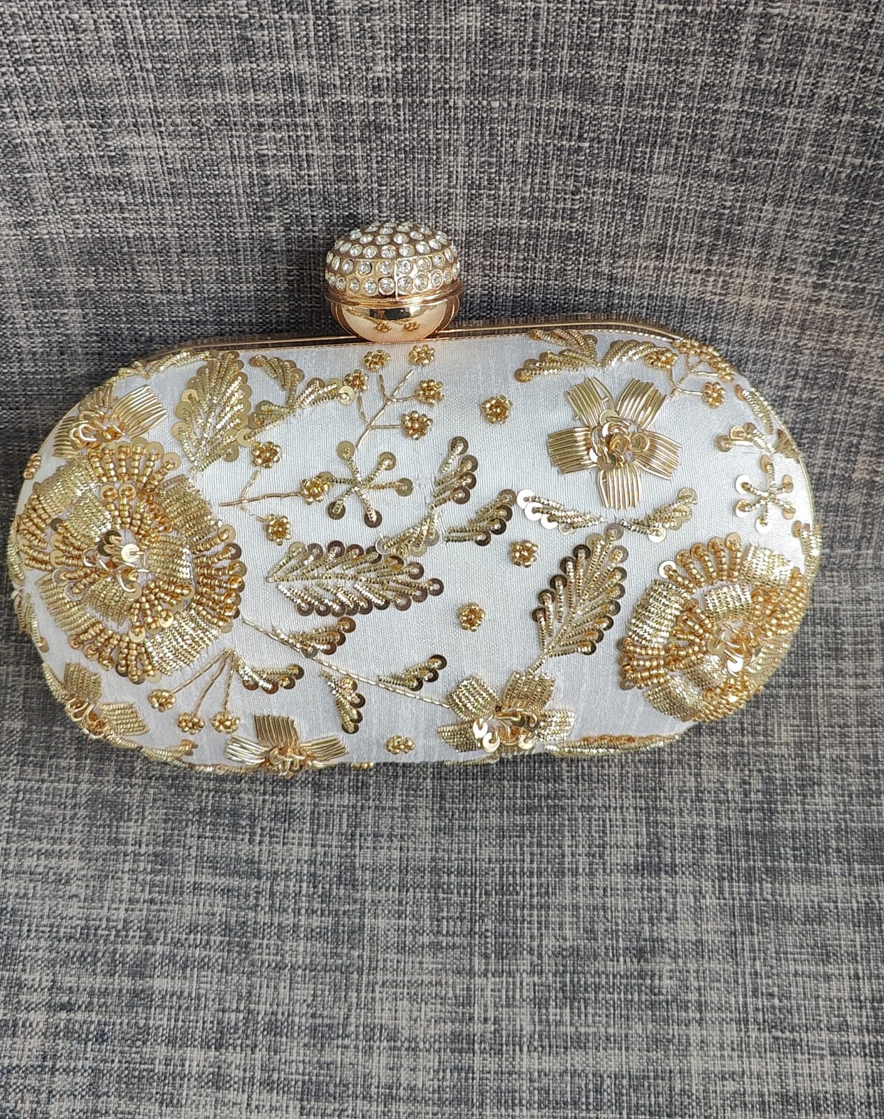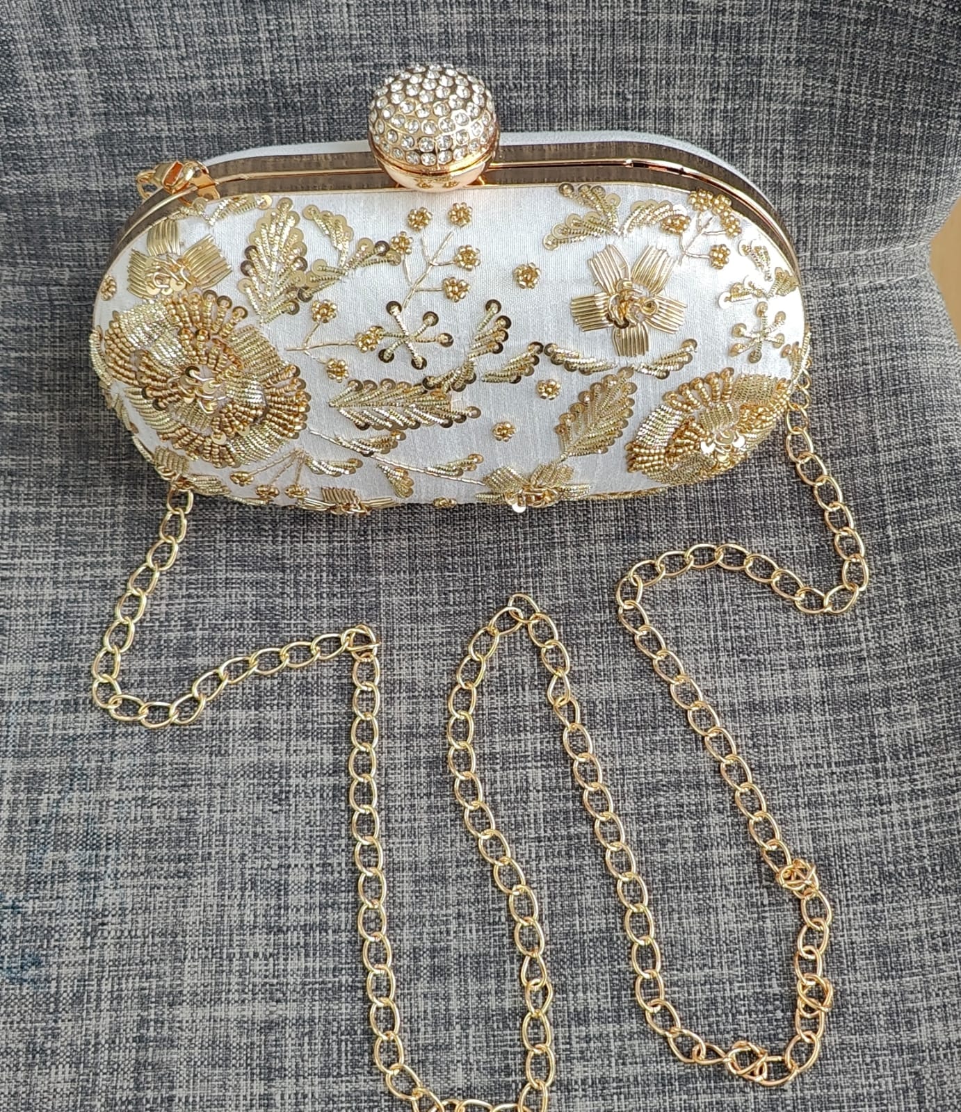 The White Silk Clutch reflects timeless grace and refined luxury. Crafted with a smooth silk finish, it showcases a delicate balance of tradition and modern style. Finished with a diamond-stone metal clasp and a detachable chain sling, it is light, elegant, and practical. Ideal for wedding functions, festive events, and evening gatherings.