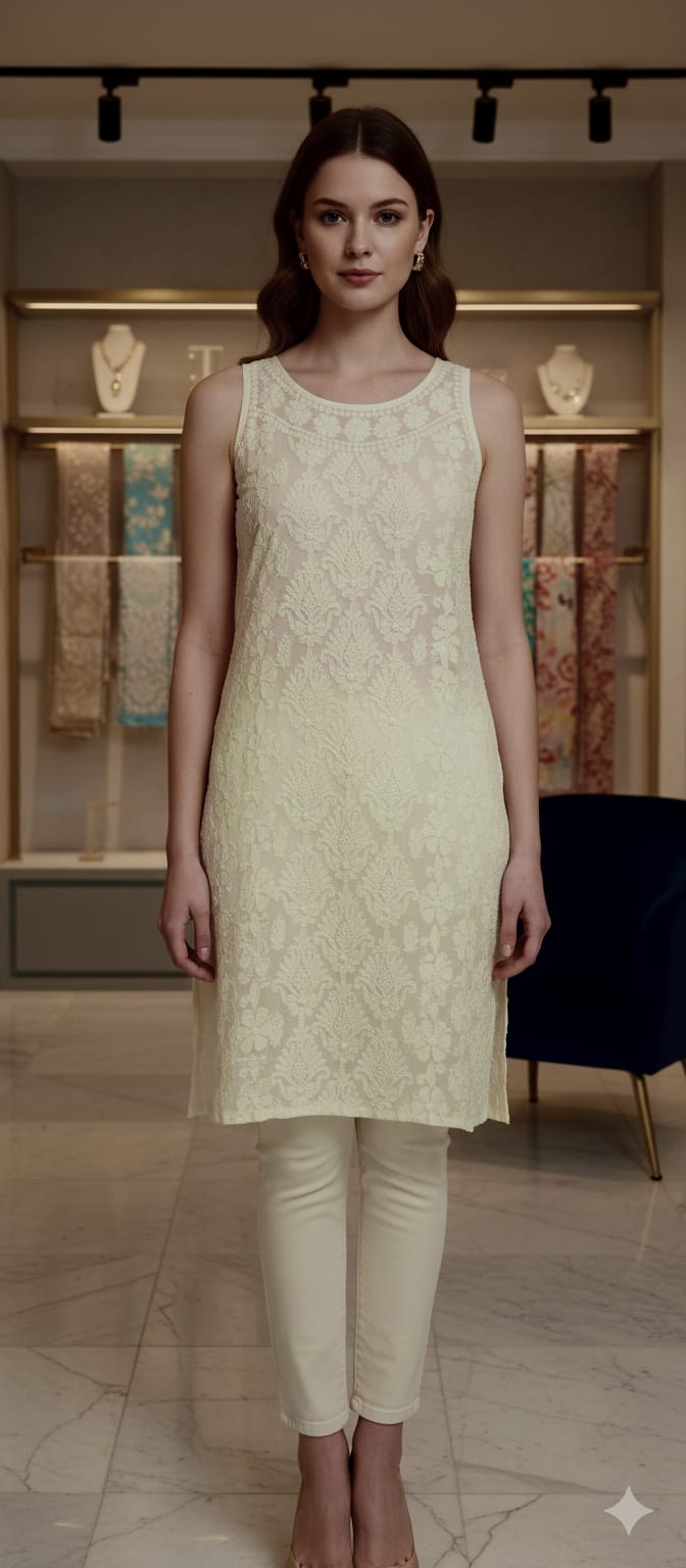 This mid Length kurti is a beautifully crafted ethnic garment that blend's traditional. Indian Embroidery techniques with contemporary style. It ensures comfort & breathability through out the day. Suitable for office & College going. Chikankari garments are perfect to pair with your favorite pants or regular denim. Be it a casual or a semi-formal event these are certainly your best choice for any occasion.