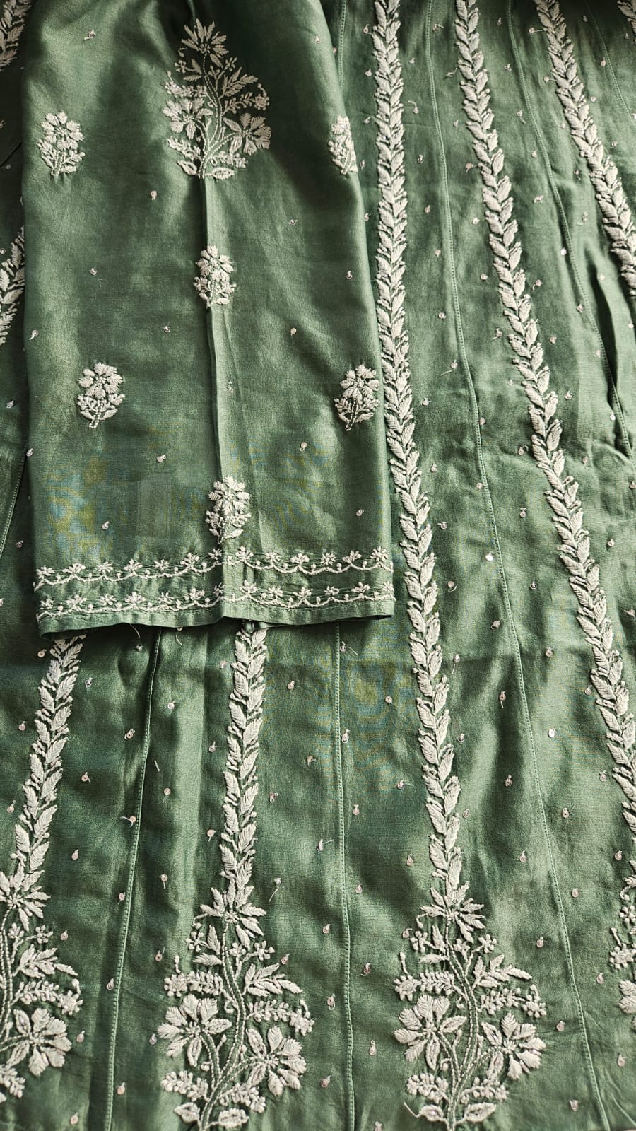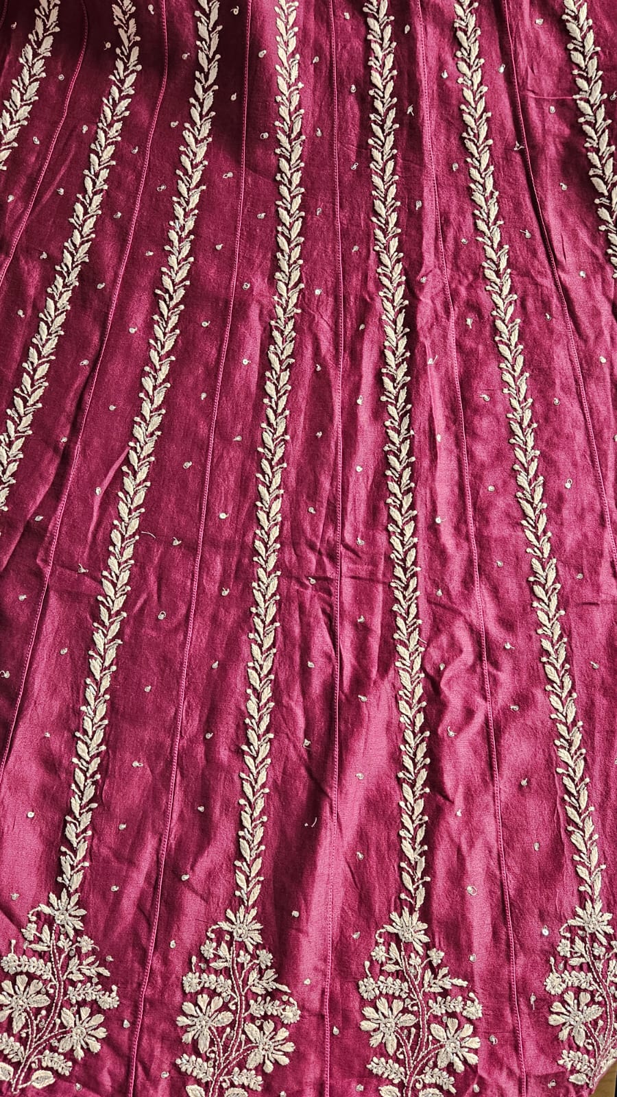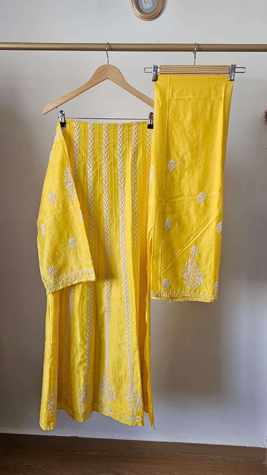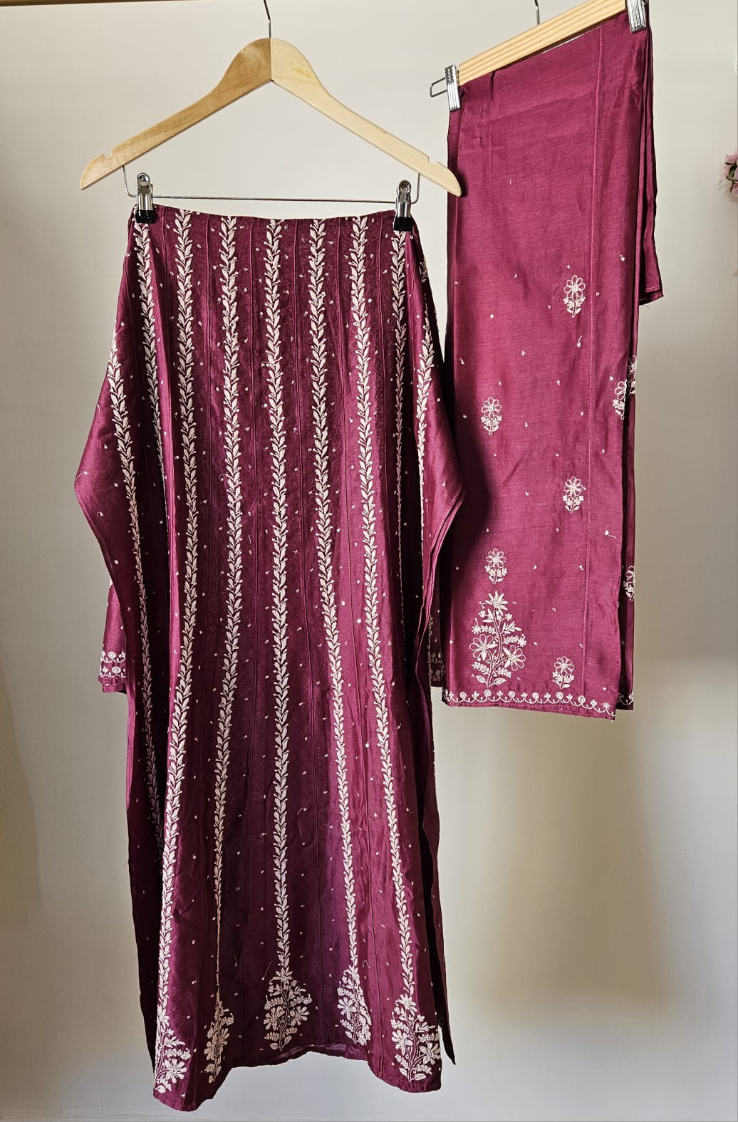 At Aaparya , each piece is crafted with genuine craftsmanship ensuring authenticity and timeless beauty . Presenting a Chanderi CO-ORD set with Chikankari embellished with Cutdana and sequence .