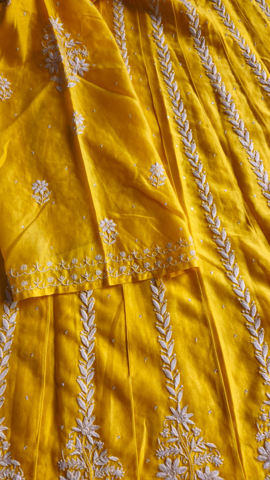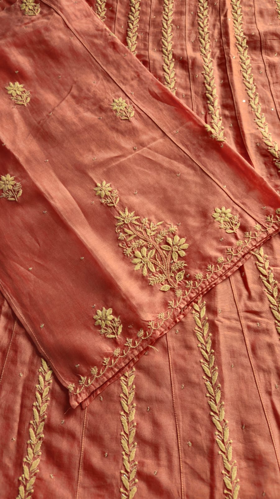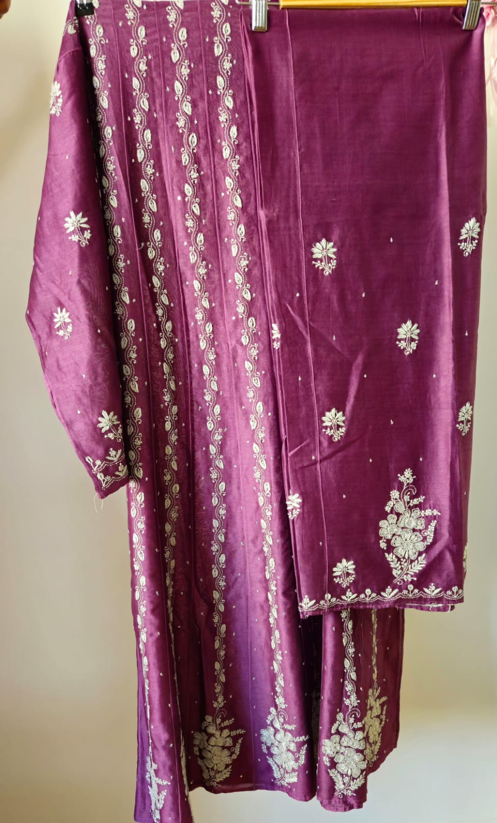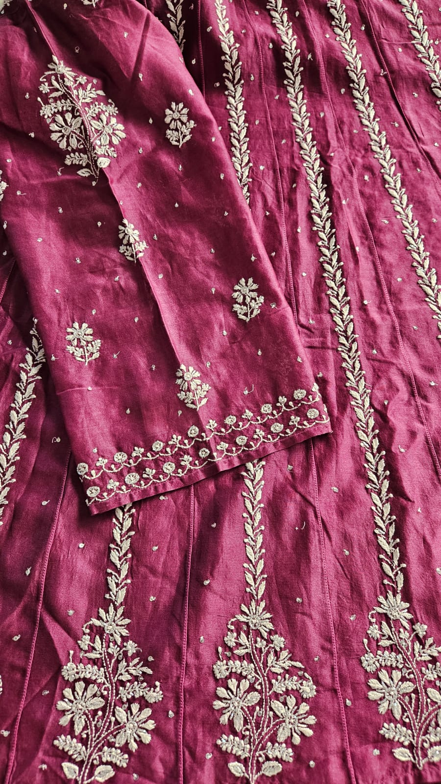 At Aaparya , each piece is crafted with genuine craftsmanship ensuring authenticity and timeless beauty . Presenting a Chanderi CO-ORD set with Chikankari embellished with Cutdana and sequence .