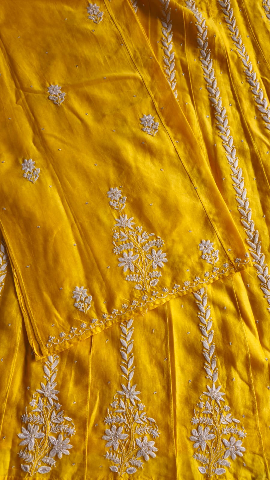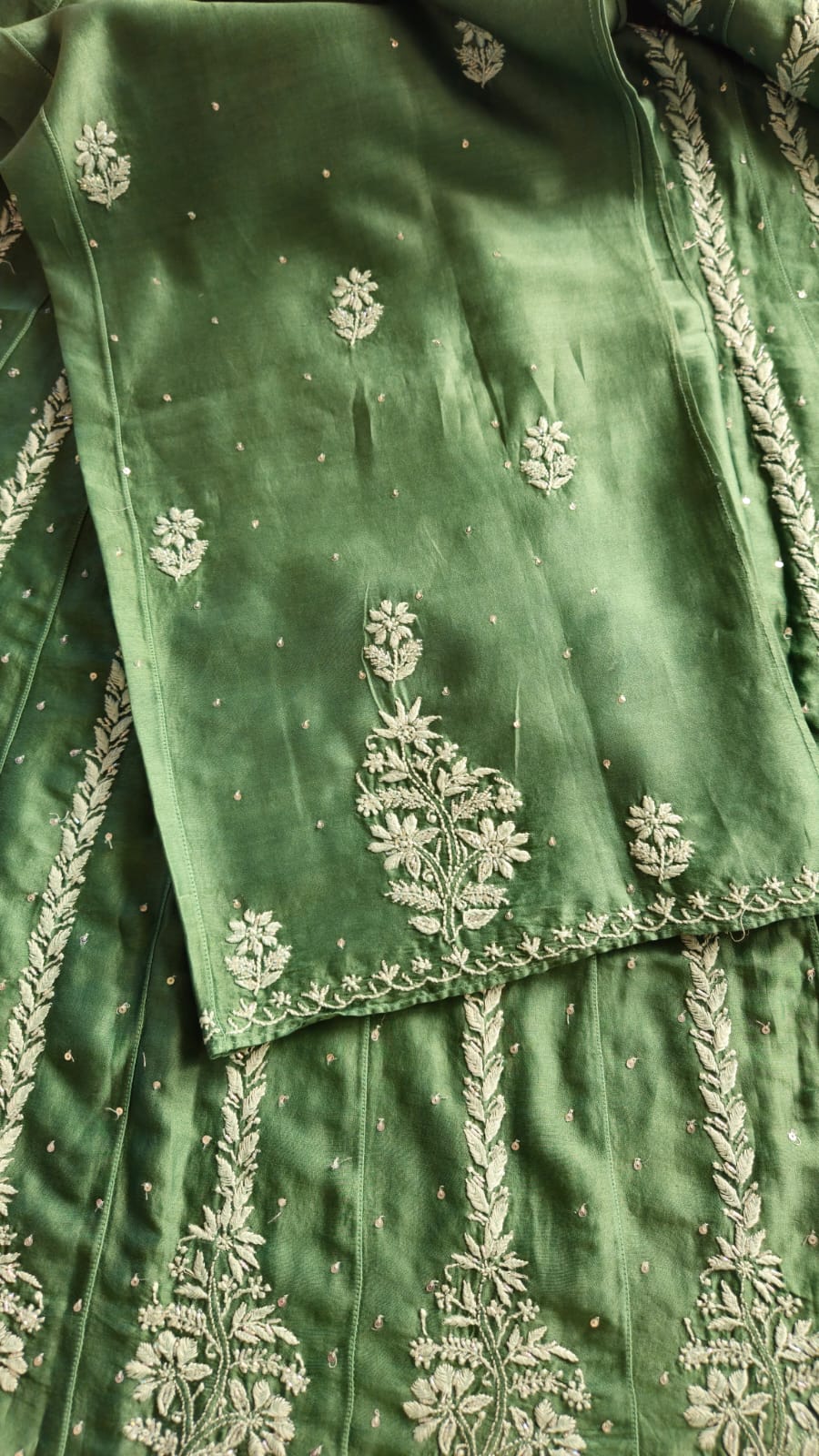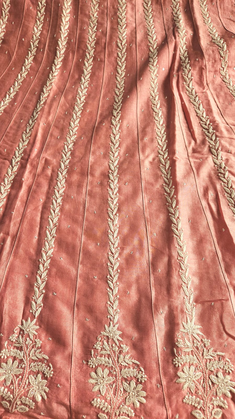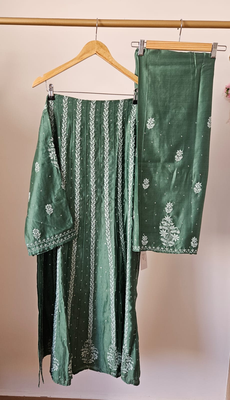 At Aaparya , each piece is crafted with genuine craftsmanship ensuring authenticity and timeless beauty . Presenting a Chanderi CO-ORD set with Chikankari embellished with Cutdana and sequence .