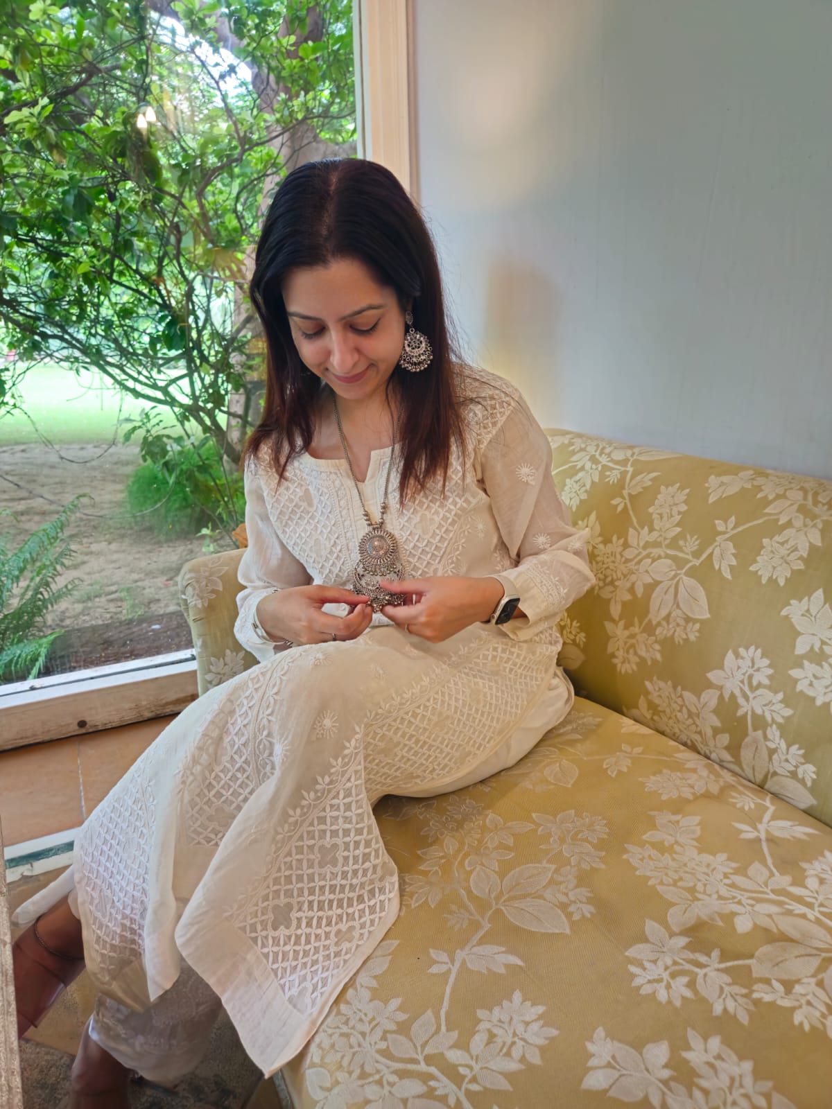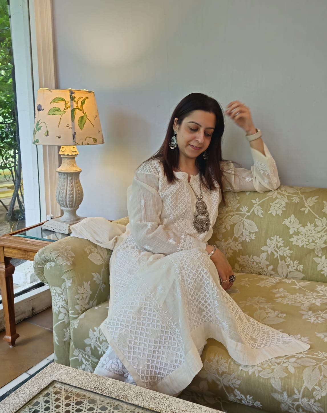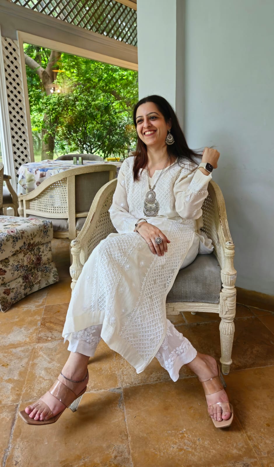 An Ivory Mulchanderi Kurti with intricate Chikankari Work with details like keel, kangan and ghasspati . In every delicate stitch of chikankari lies a story of heritage andcraftmanship .