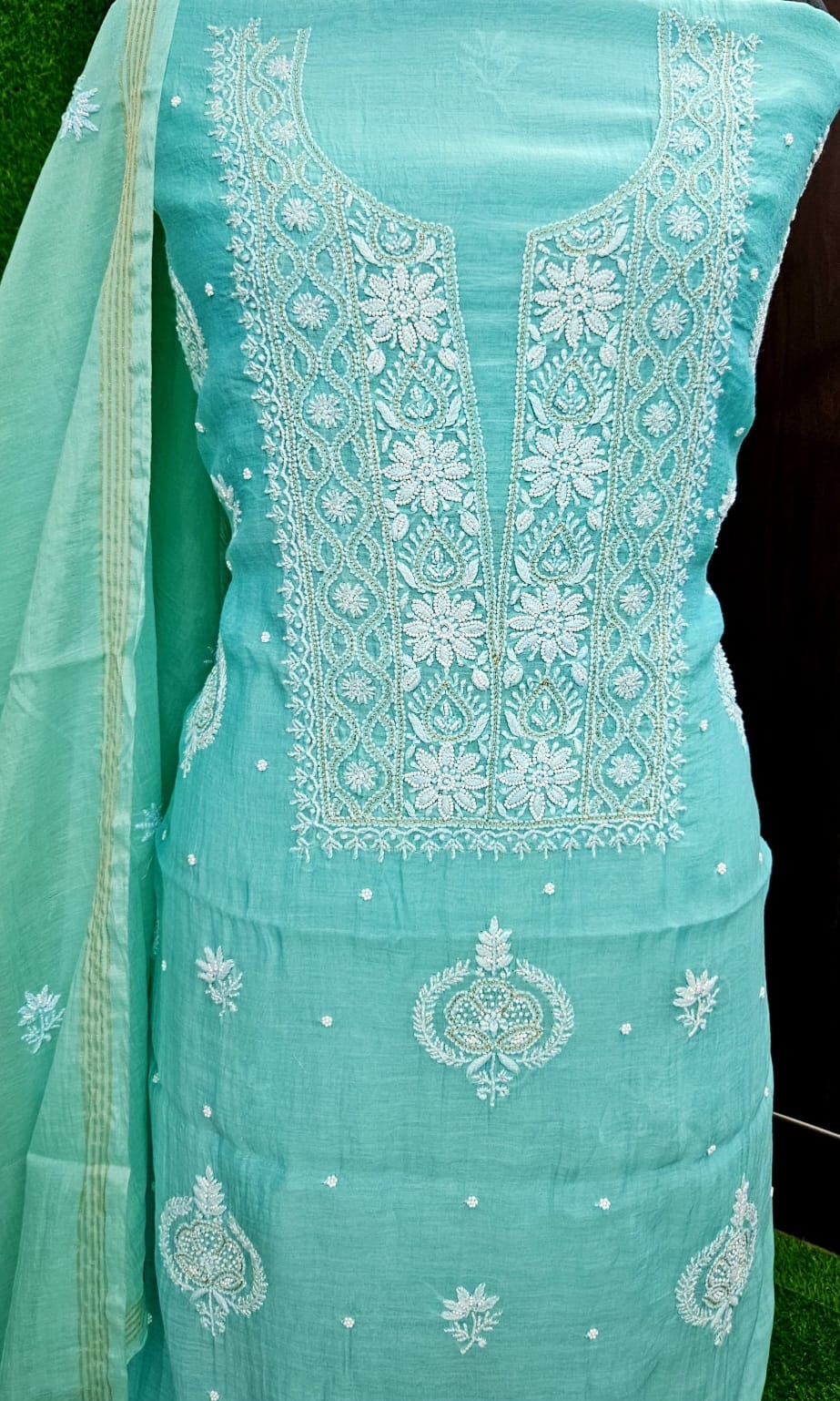 This elegant Mal Chanderi suit features exquisite embellishments of pearls, cut-dana and Ghas patti, adding a refined sparkle to the ensemble.