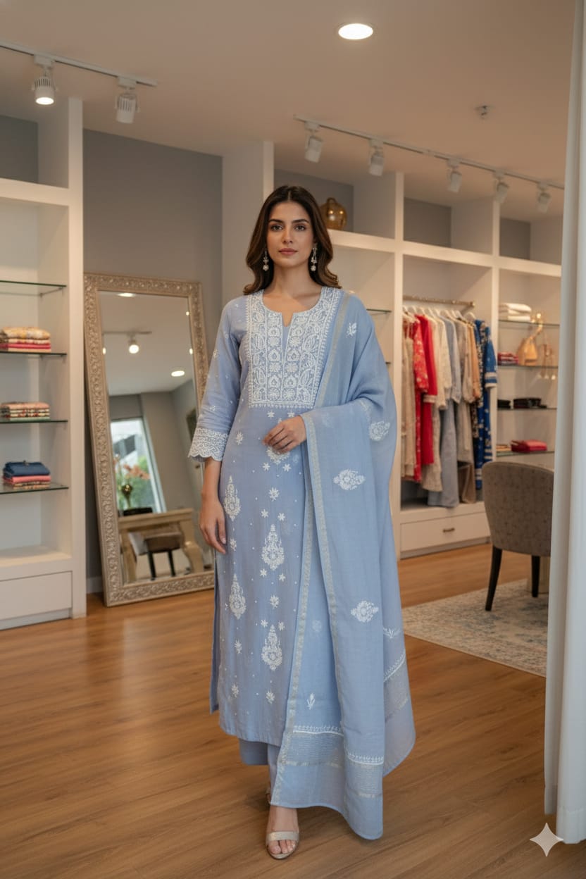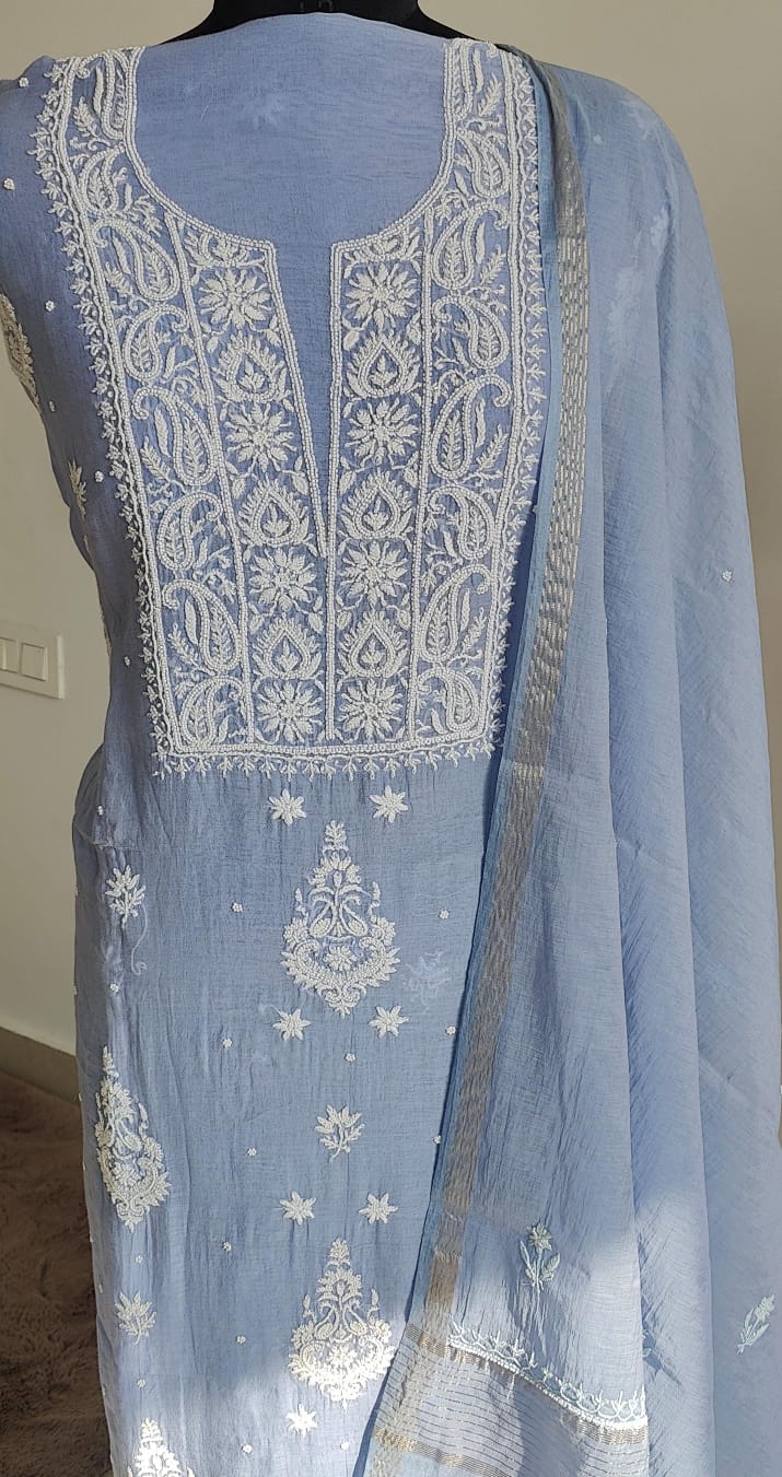 This luxurious Mal Chanderi suit is highlighted with hand-embellished cut-daana, pearl and ghass patti work, adding a refined sparkle to the outfit. The pastel-hued neckline enhances its subtle charm, making it perfect for festive and occasion wear. Soft texture, elegant fall and intricate detailing make this piece truly timeless