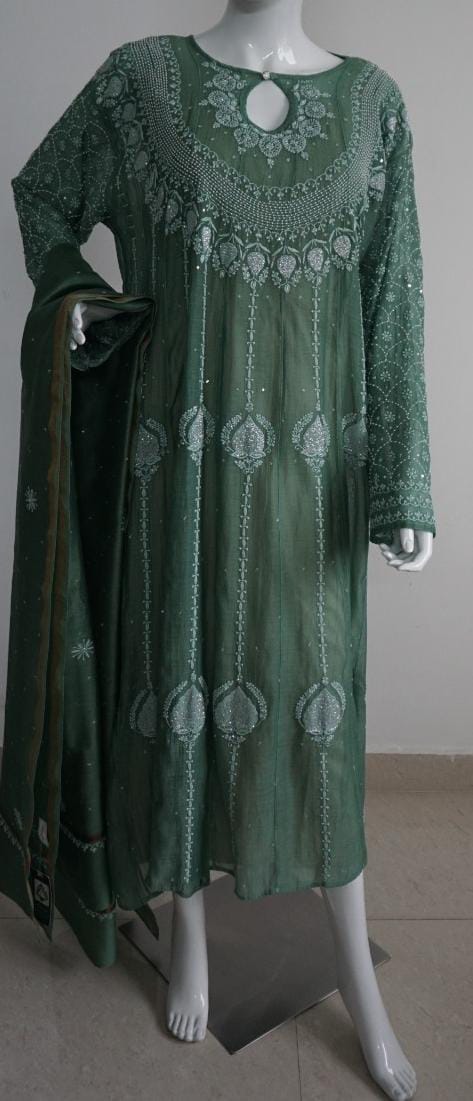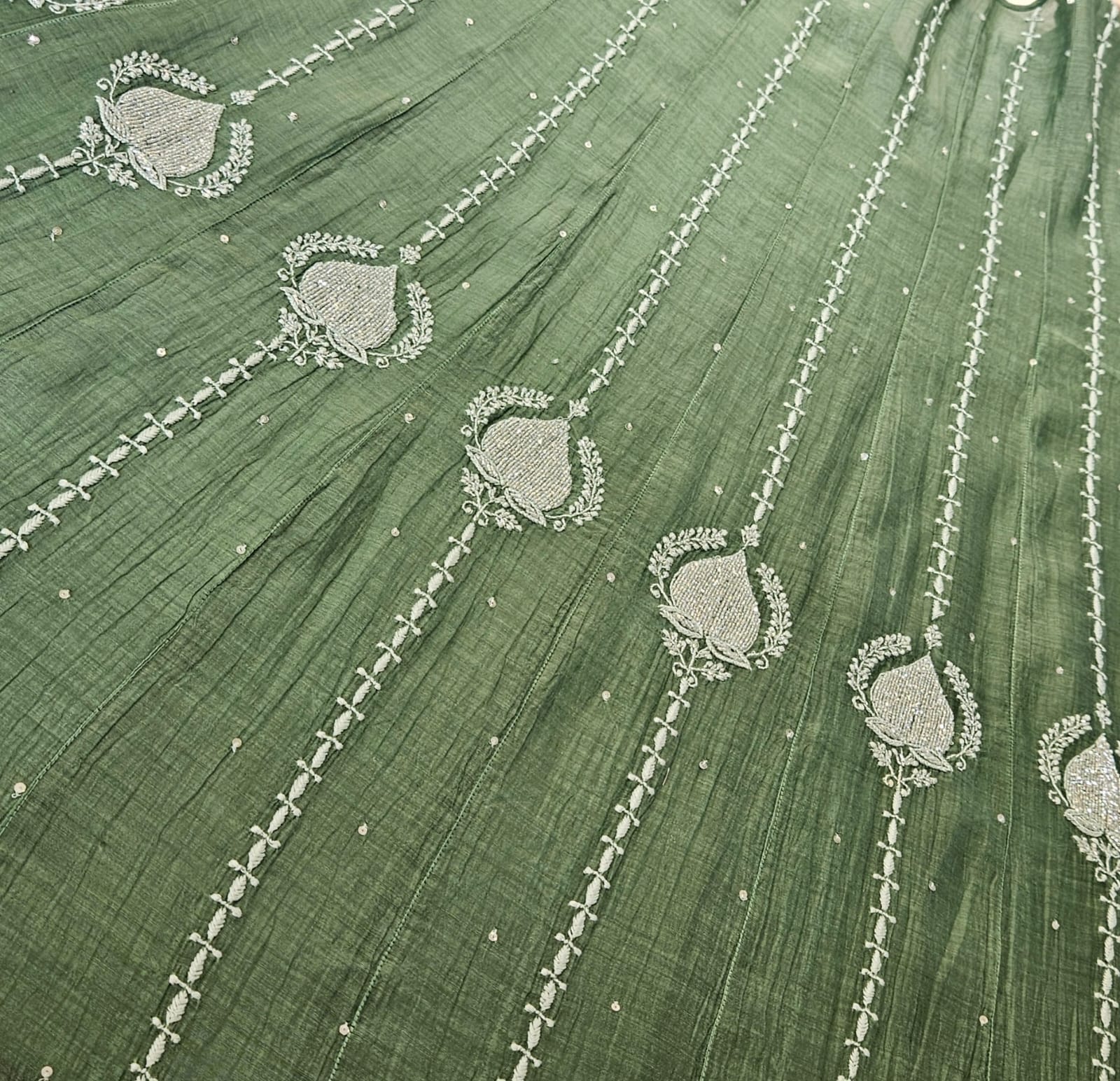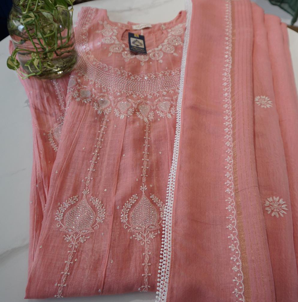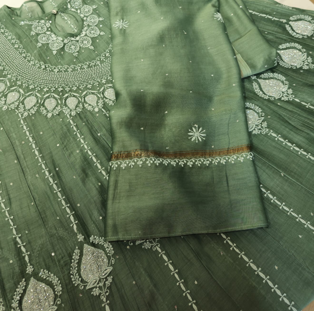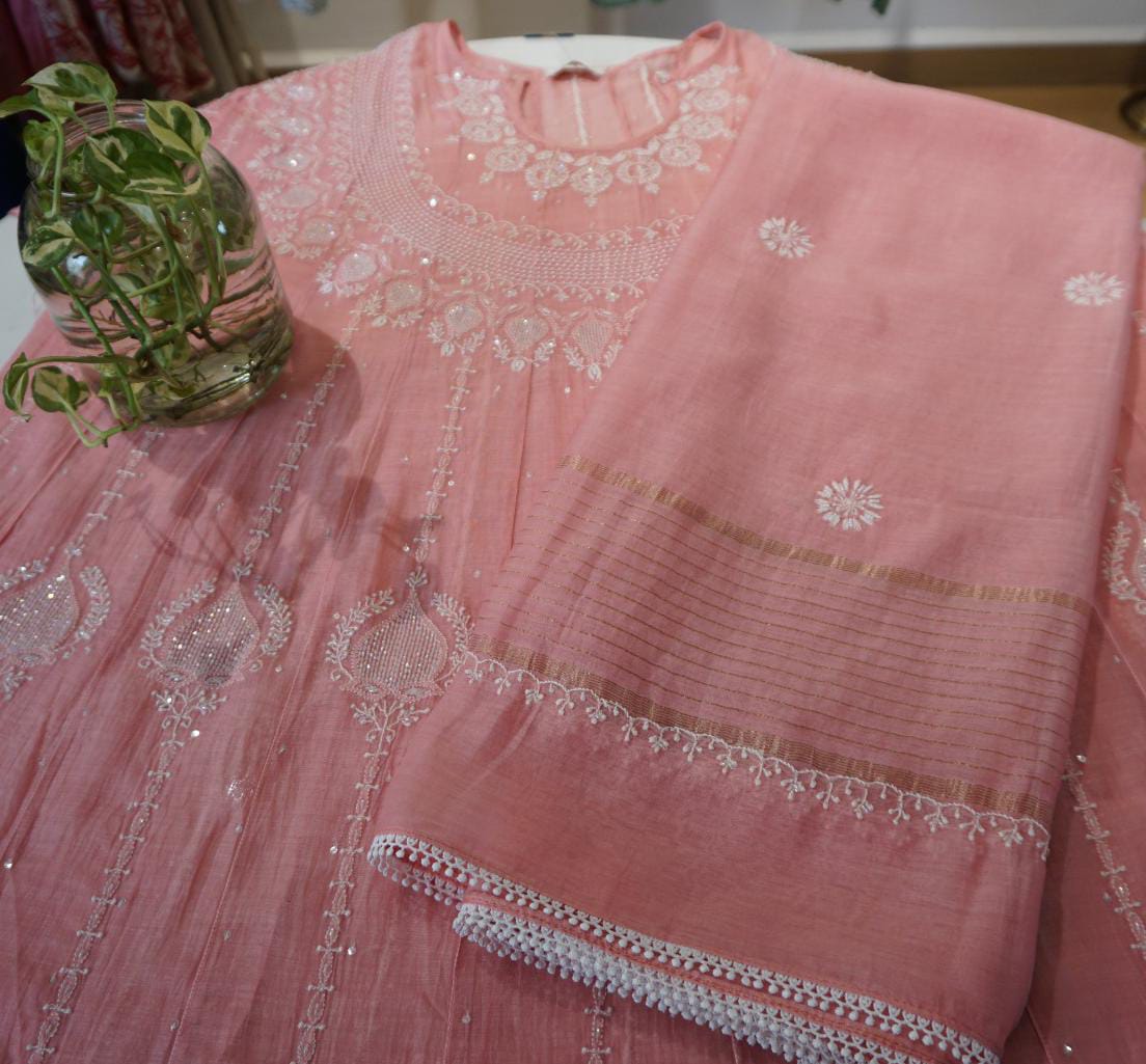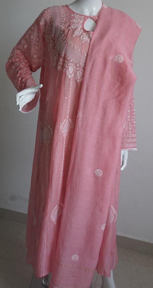 Adorn in our new design of Mulchanderi Bajirao Chikankari Anarkali suit with intricate chikankari adorned with cut dana and pearl embellishment . It is available in pastel pink and sage Green. .
