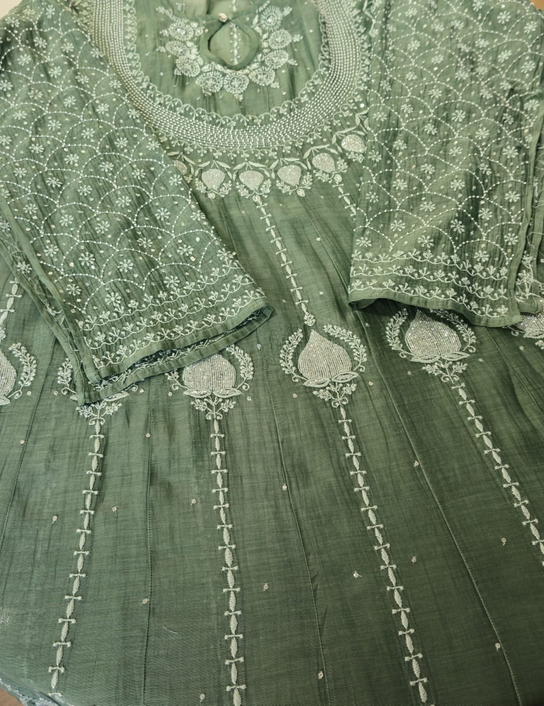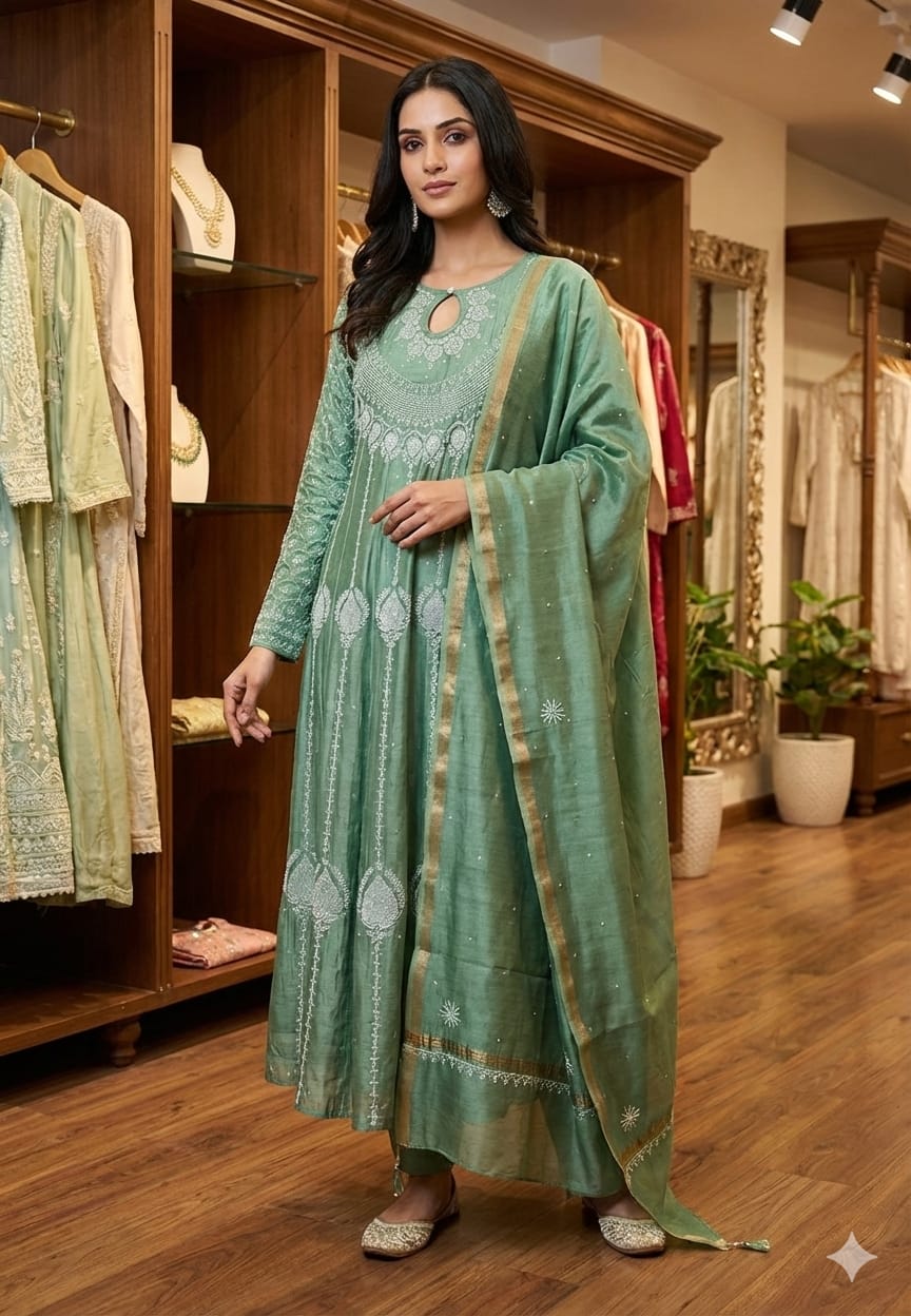 Adorn in our new design of Malchanderi Bajirao Chikankari Anarkali suit with intricate chikankari adorned with cutdaana and pearl embellishment . It is available in sage Green. .