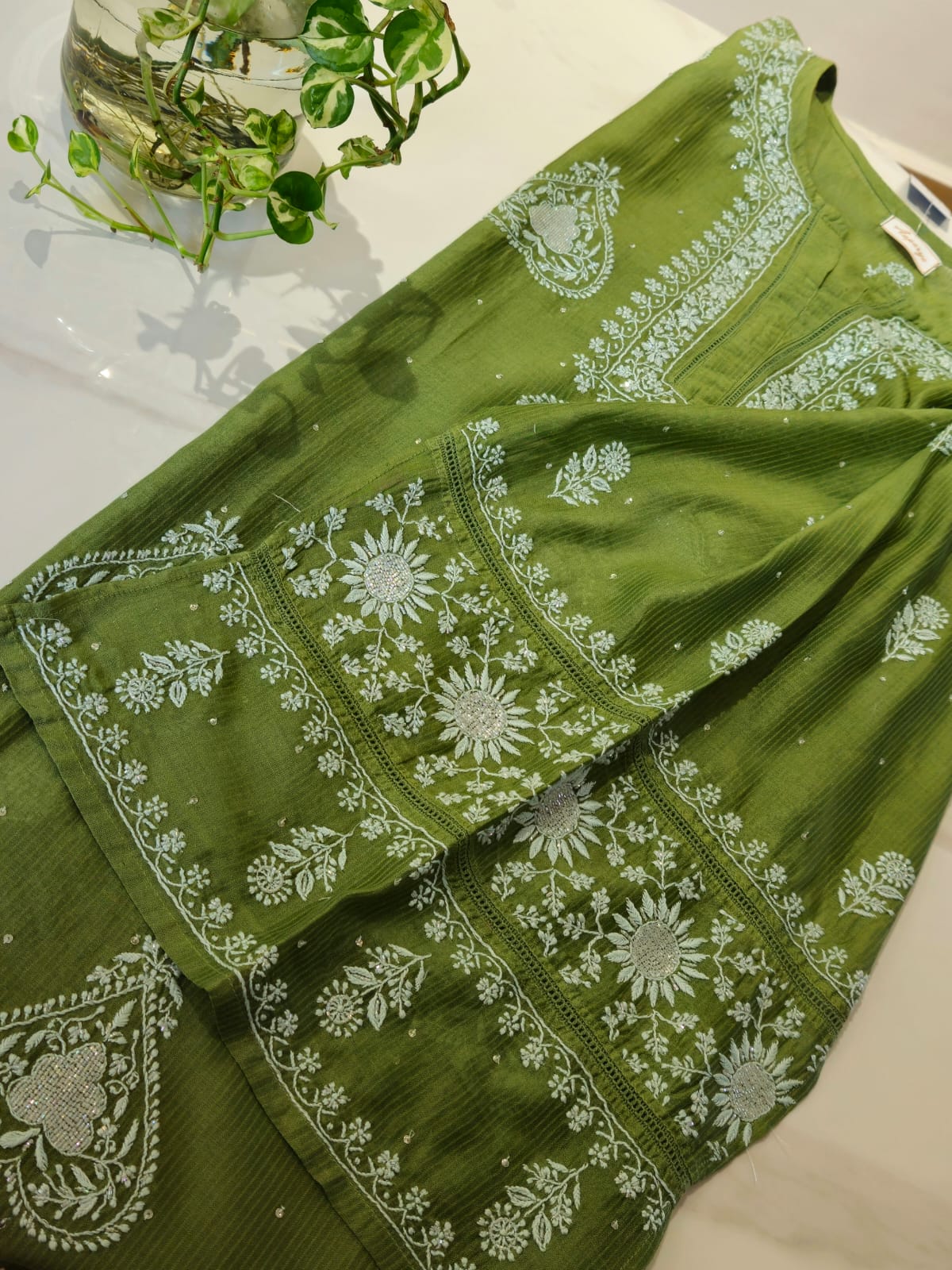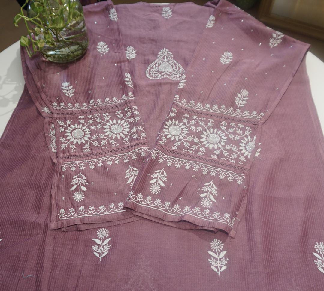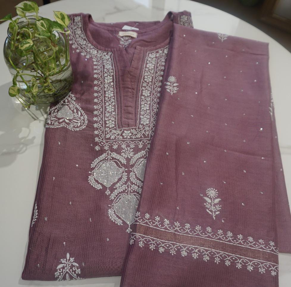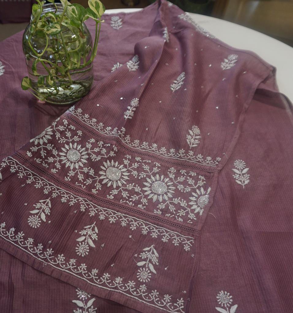 In every delicate stitch of Chikankari , there is a story of Heritage and Craftmanship . Step into our newly launched Mulchanderi suit with intricate chikankari work with Cut dana and sequence work . It is available in green and Plum shade .