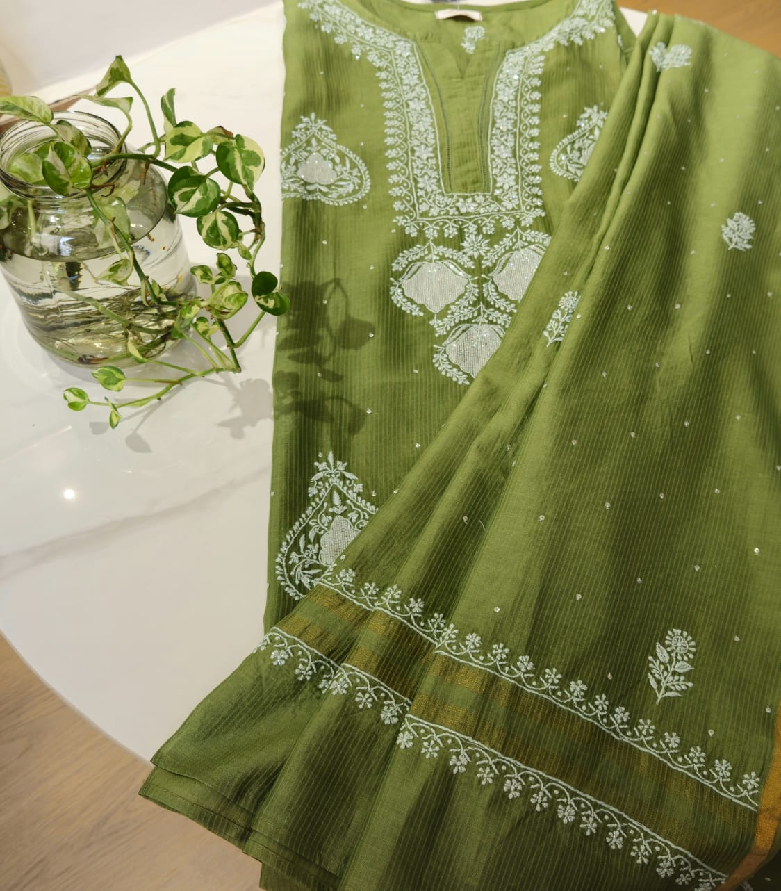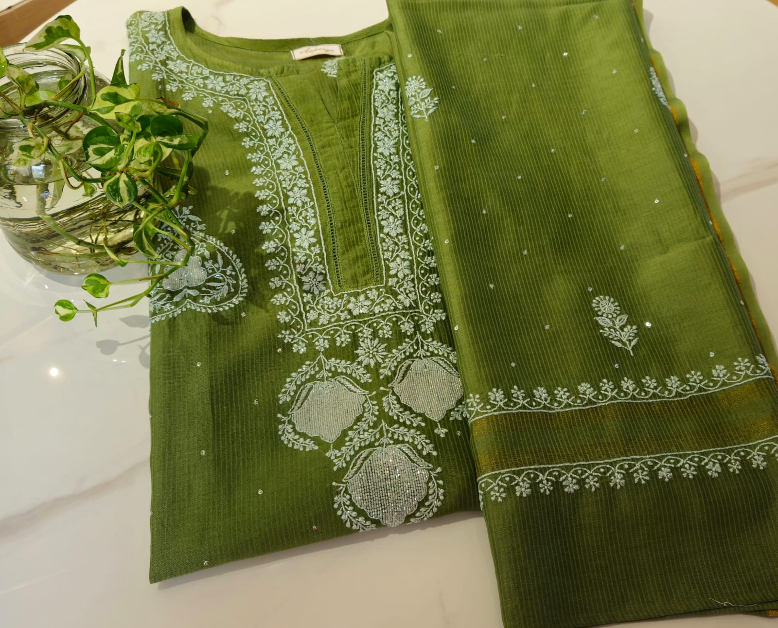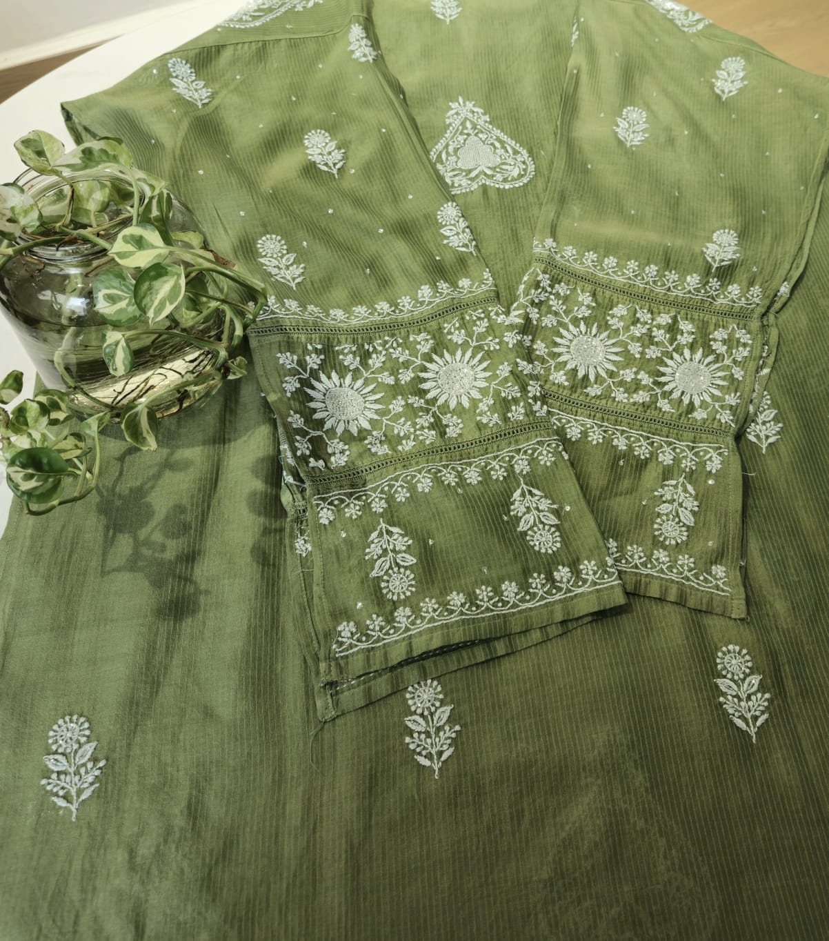 In every delicate stitch of Chikankari , there is a story of Heritage and Craftmanship . Step into our newly launched Mulchanderi suit with intricate chikankari work with Cut dana and sequence work . It is available in green and Plum shade .