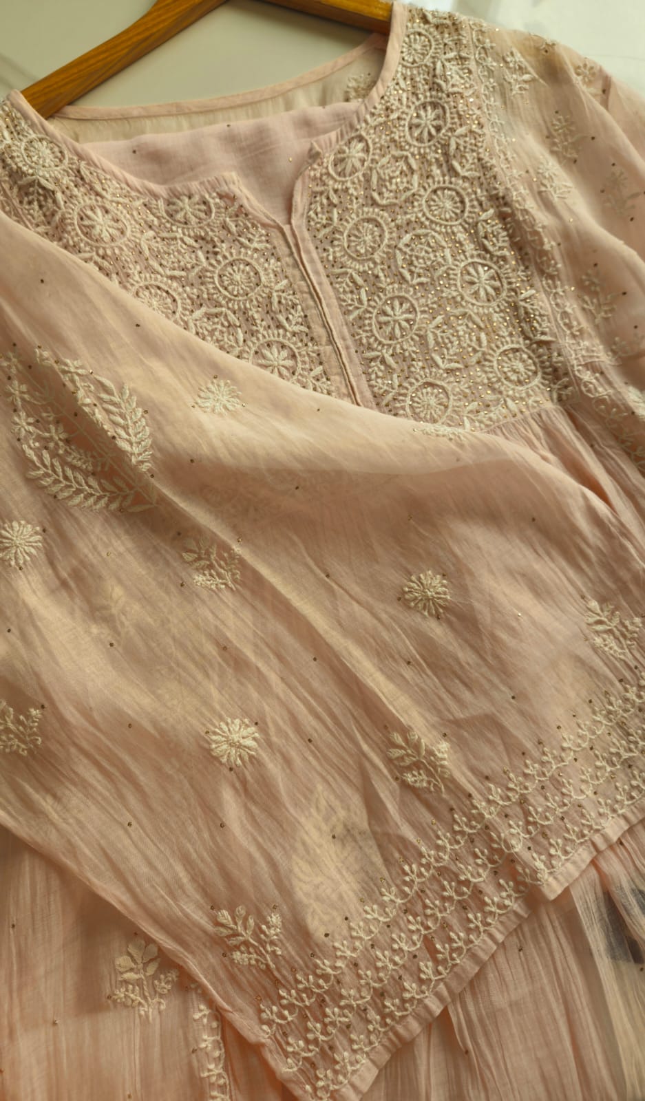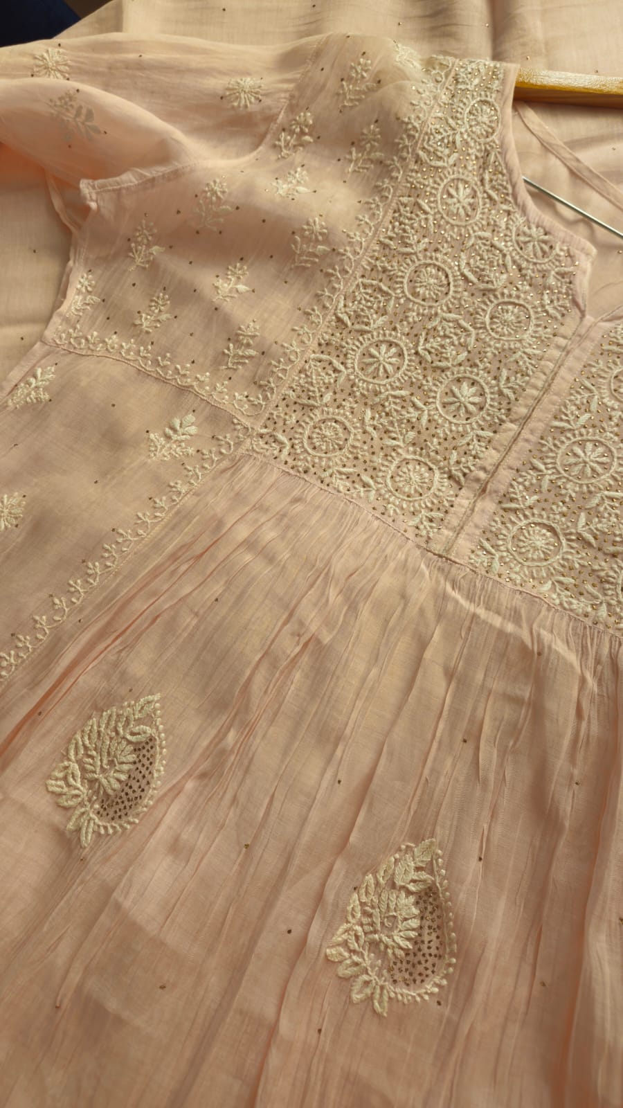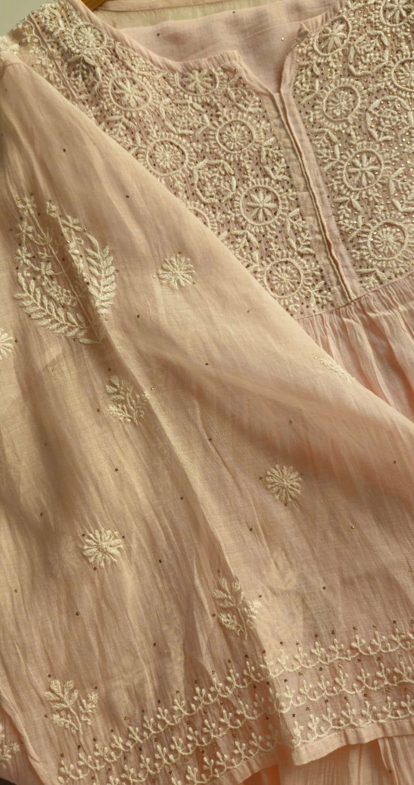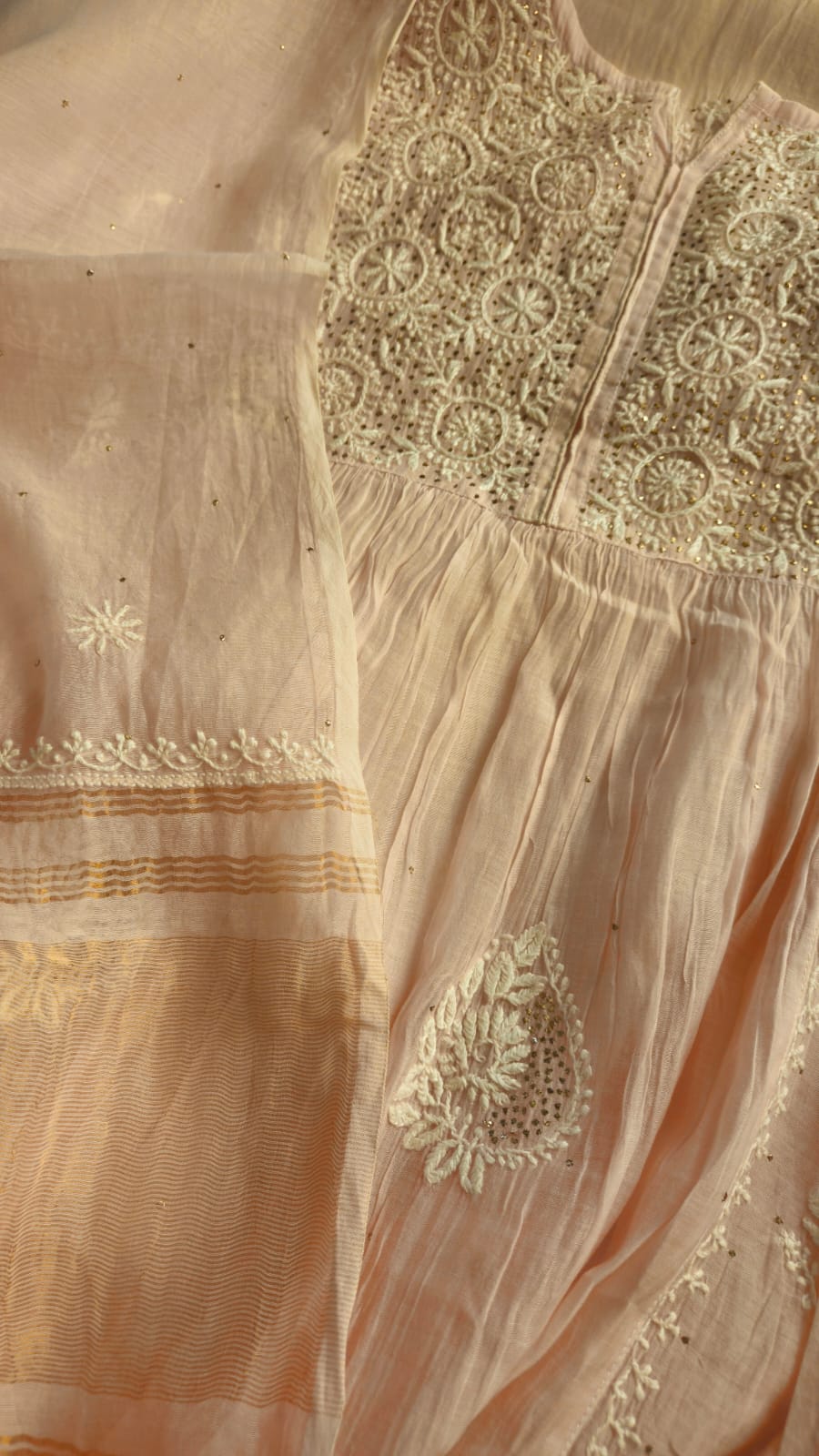 Experience the opulence of chikankari on pure Mulchanderi in Nyracut elegantly adorned with sequences and cutdana with detailing of lace .