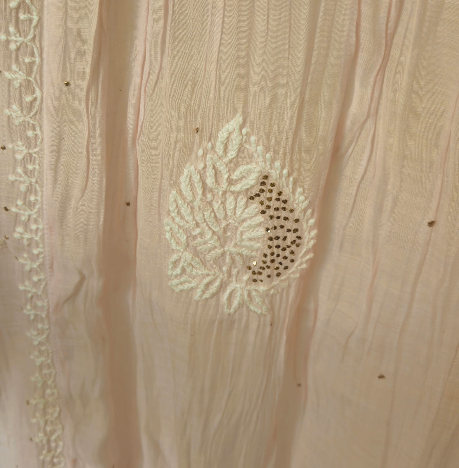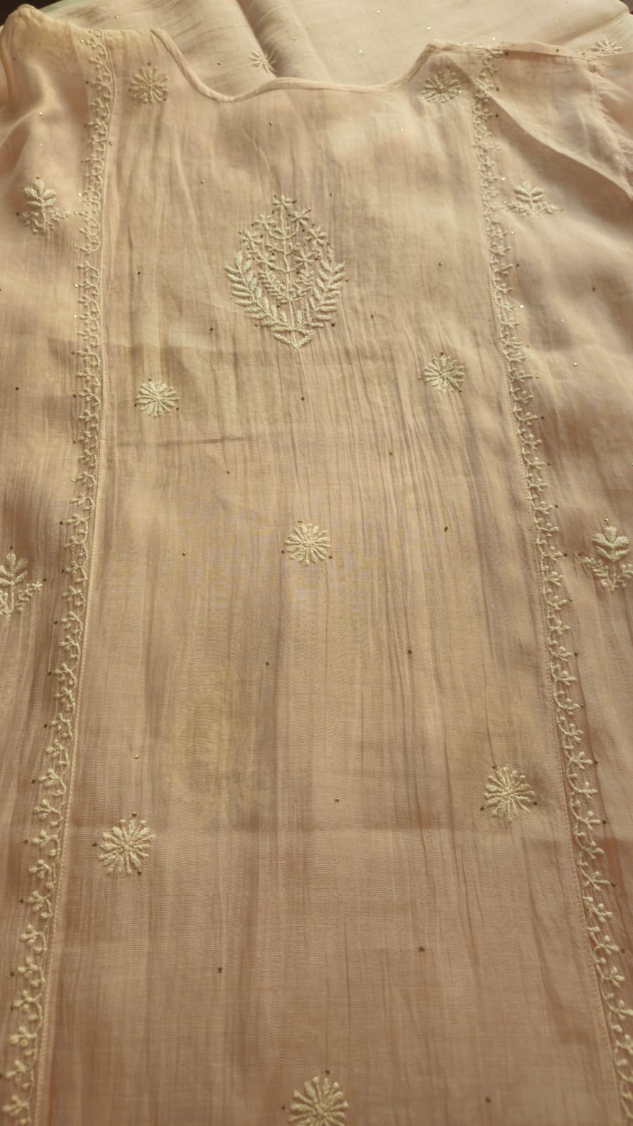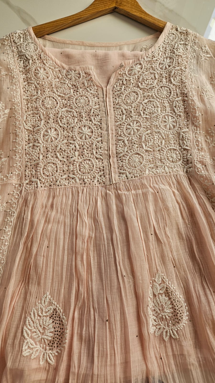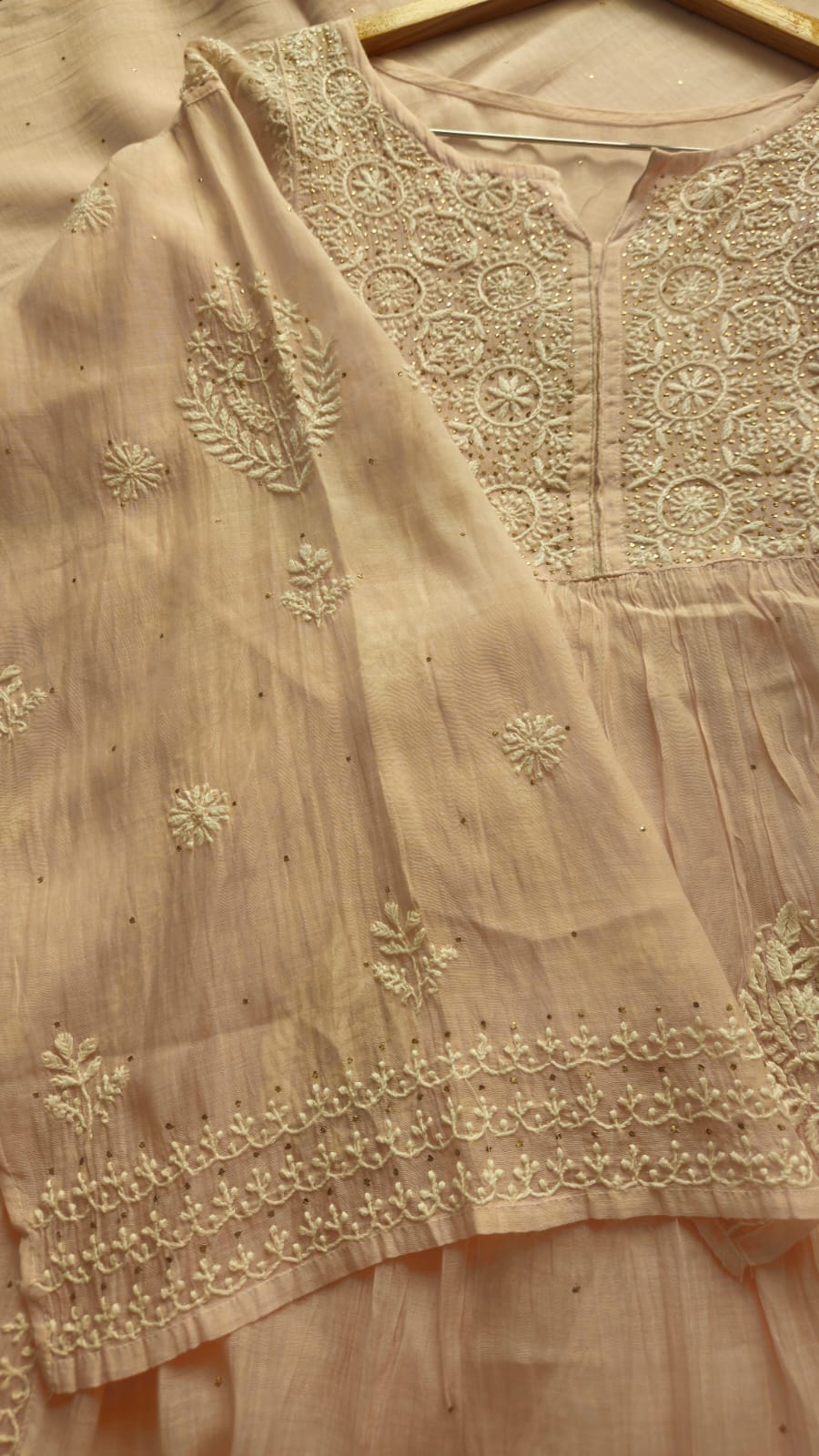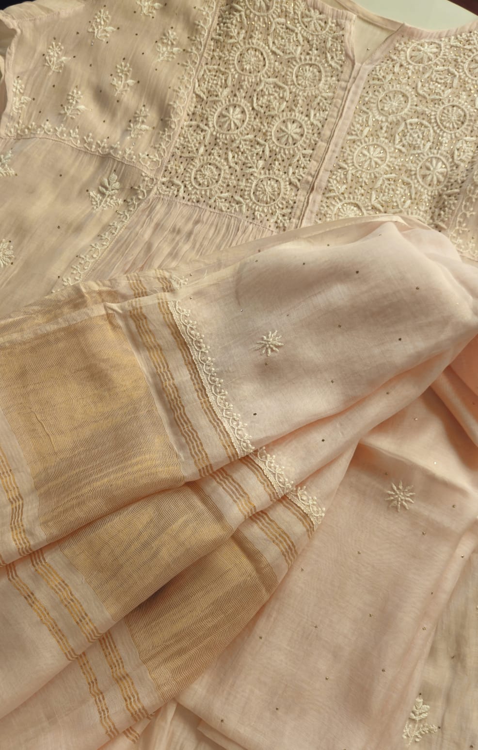 Experience the opulence of chikankari on pure Mulchanderi in Nyracut elegantly adorned with sequences and cutdana with detailing of lace .