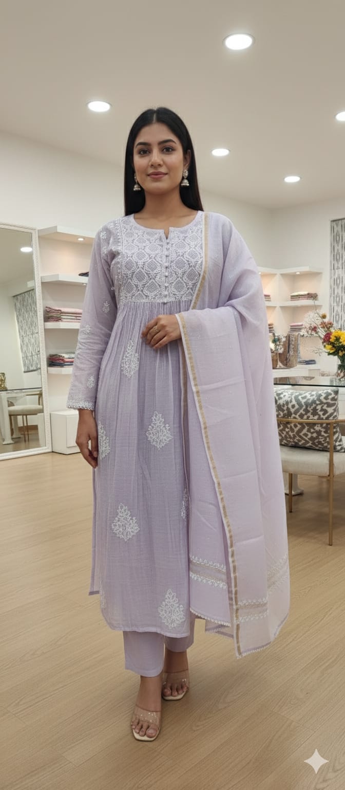 Exude sophistication and poise in our stunning Nyracut Mulchanderi Chikankari Suit in Lavender shade , perfect for special occasions . Experience the grace of a timeless chikankari displaying months of labour of love and craftmanship put in by our karigars and design team .
