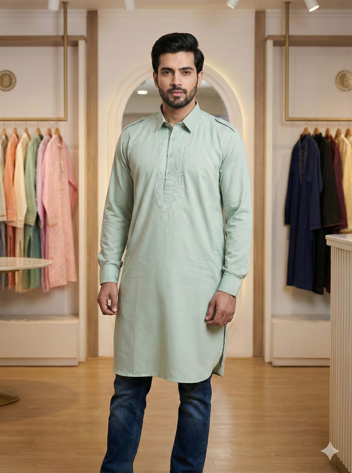 The stylish Pathani collar and short-length design give it a trendy yet traditional touch. You can pair it effortlessly with pajamas for a classic look or jeans for a smart casual style.