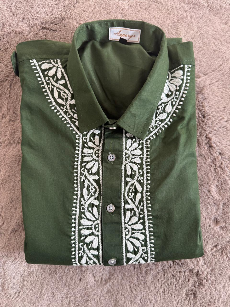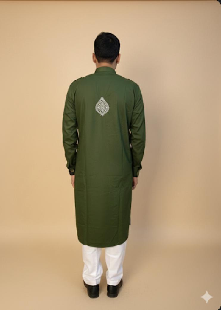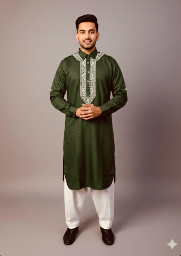 Classic Pathani set crafted in rich premium fabric, featuring a stylish shirt collar and elegant Chikankari-style detailing. Green Perfect for festive wear, Eid, weddings, and everyday royal style.