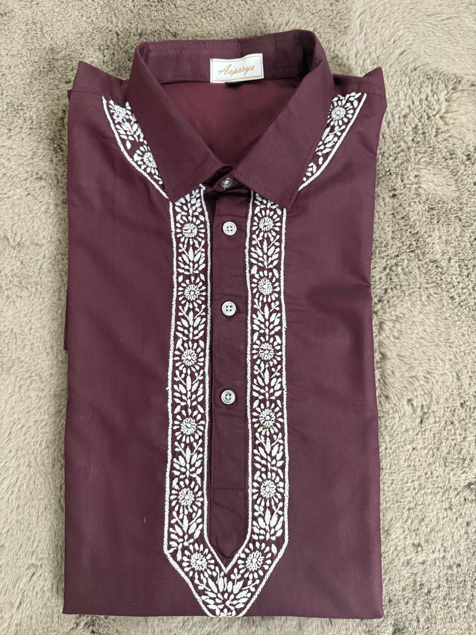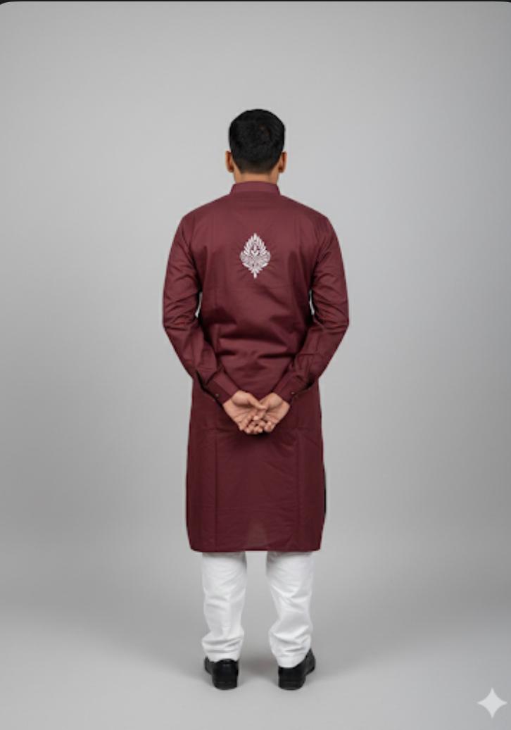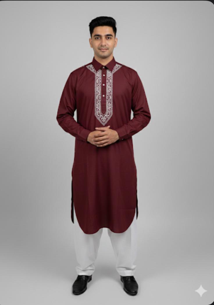 Classic Pathani set crafted in rich premium fabric, featuring a stylish shirt collar and elegant Chikankari-style detailing. Wine Perfect for festive wear, Eid, weddings and everyday royal style.