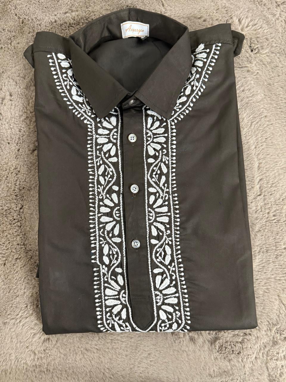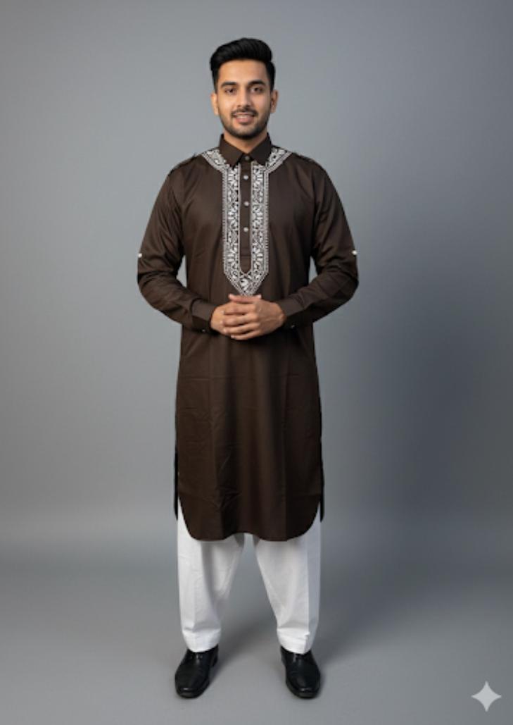 Classic Pathani set crafted in rich premium fabric, featuring a stylish shirt collar and elegant Chikankari-style detailing. Brown Perfect for festive wear, Eid, weddings, and everyday royal style.