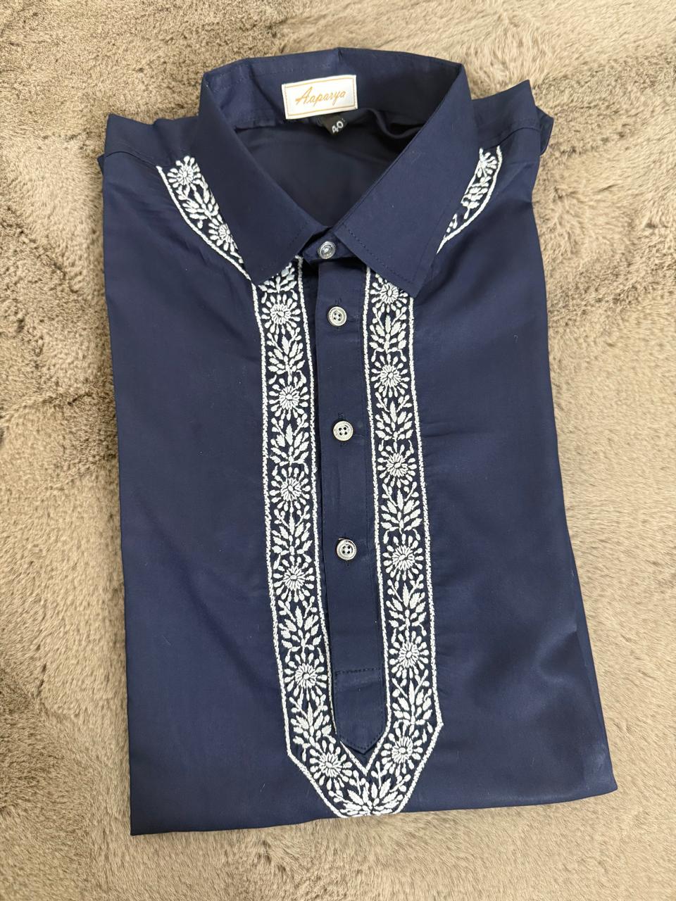 Classic Pathani set crafted in rich premium fabric, featuring a stylish shirt collar and elegant Chikankari-style detailing. Blue Perfect for festive wear, Eid, weddings, and everyday royal style.