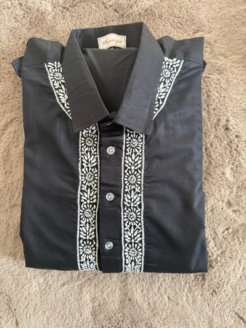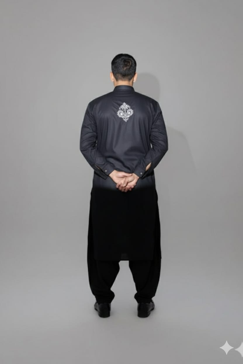 Classic Pathani set crafted in rich premium fabric, featuring a stylish shirt collar and elegant Chikankari-style detailing. Black Perfect for festive wear, Eid, weddings, and everyday royal style.