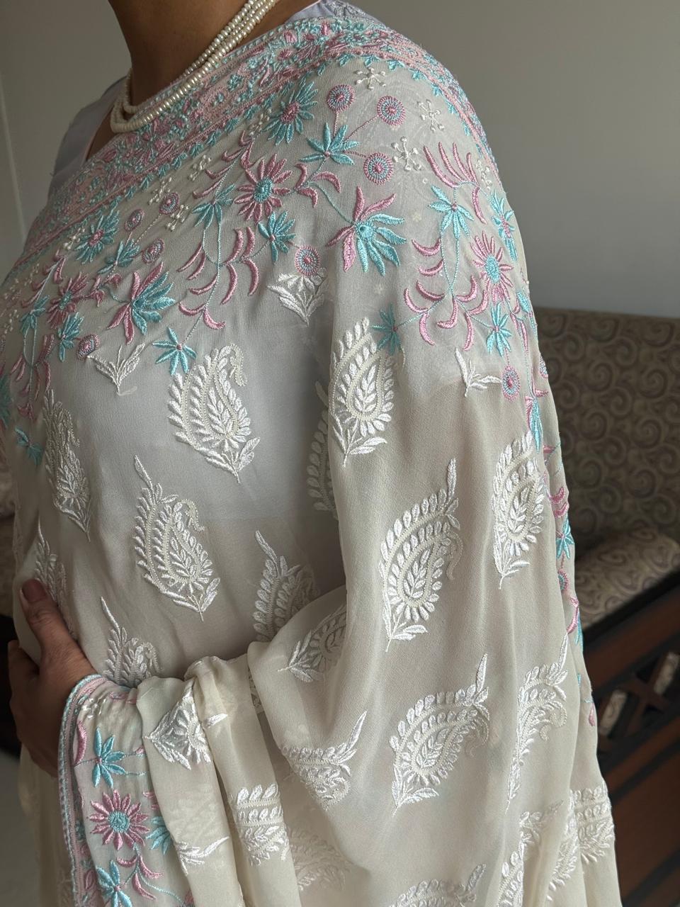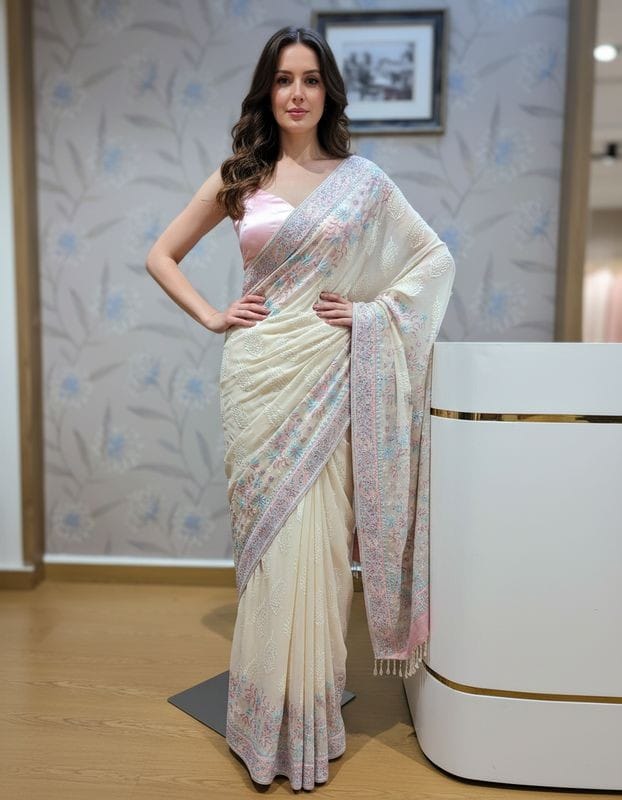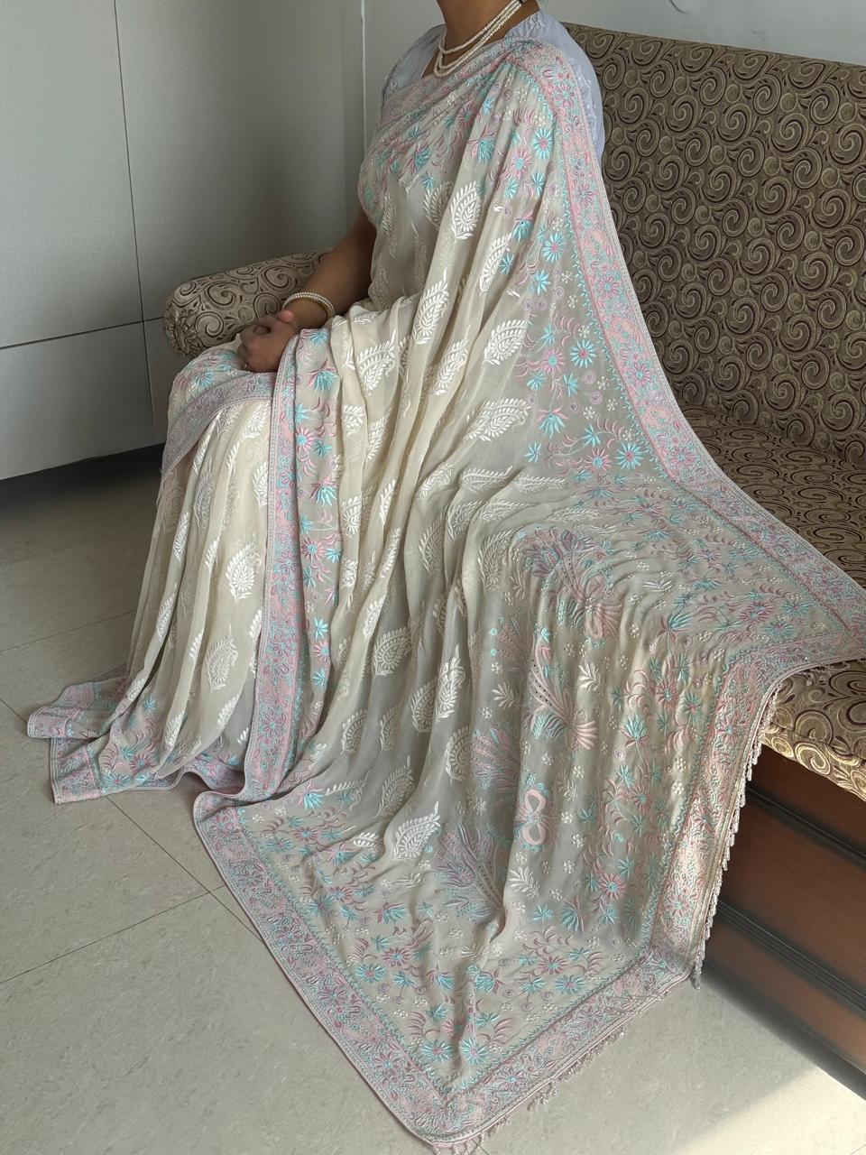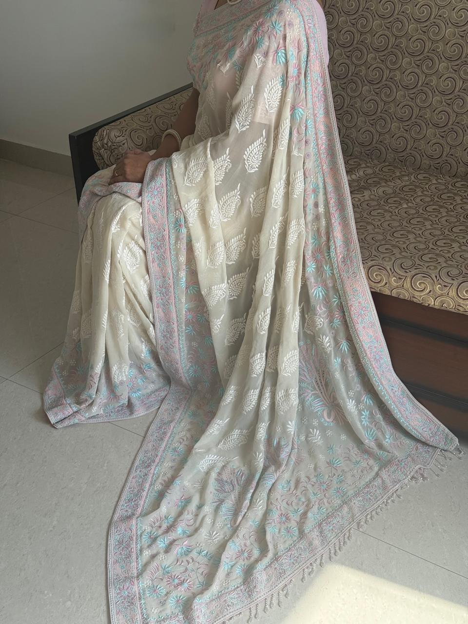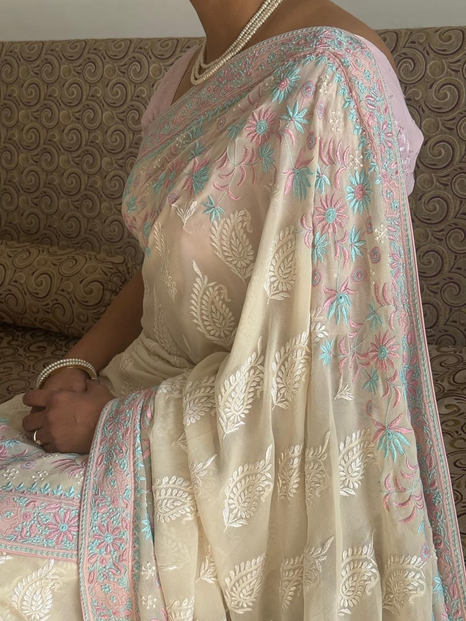 Accentuated with a Pink and Sky Blue thread work border saree, this ensemble reflects luxury party wear Chikankari saree, perfect for wedding saree, festive saree, traditional function wear, and elegant ethnic celebrations. The fluid texture of this lightweight pure georgette saree ensures a graceful drape with premium comfort, making it ideal for long occasions.