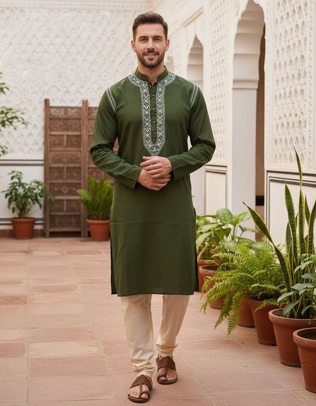 Elevate your ethnic wardrobe with this stitched Kurta Pajama Set, designed in soft linen fabric featuring intricate Chikankari-inspired detailing.