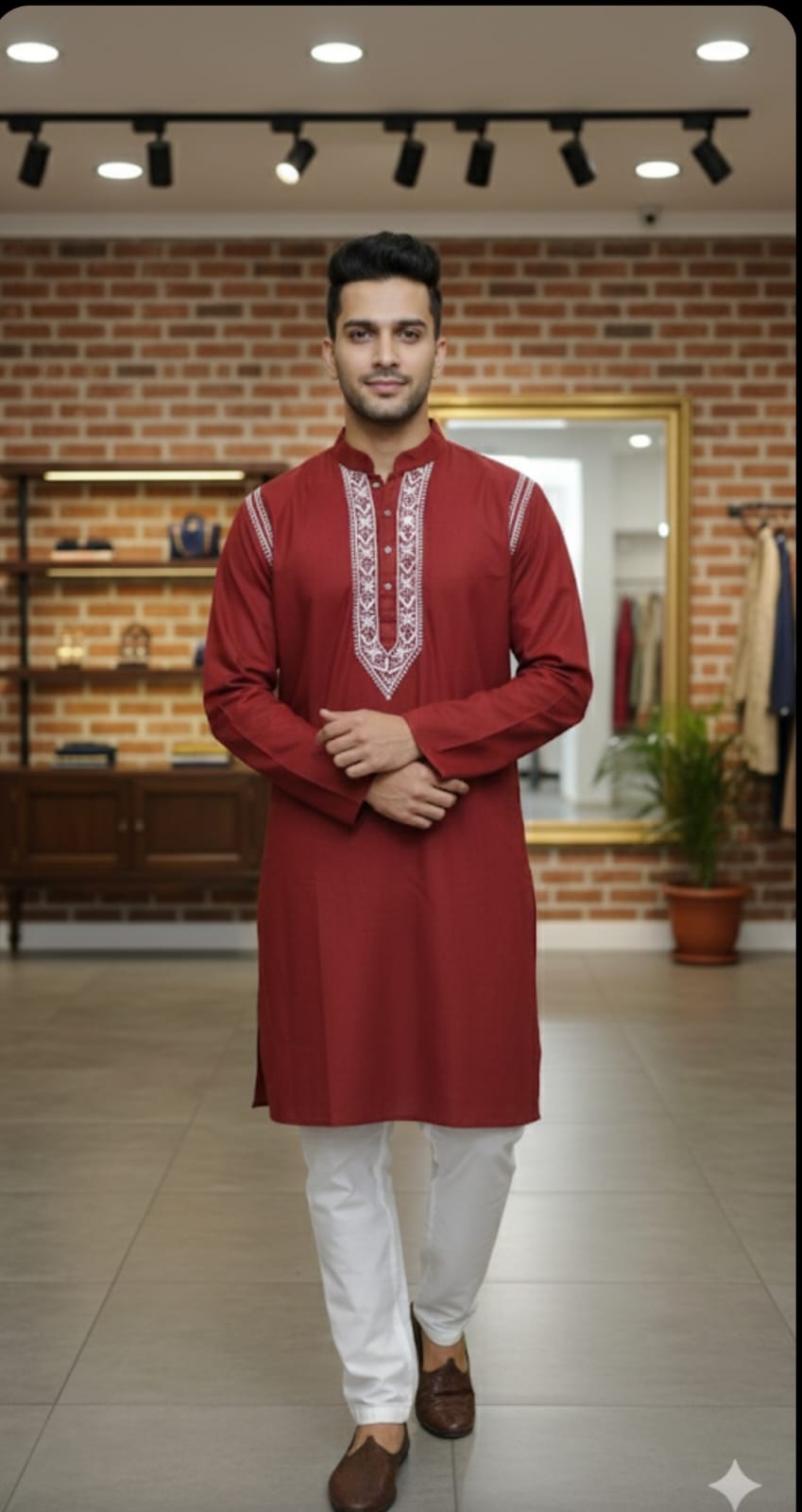Elevate your ethnic wardrobe with this stitched Kurta Pajama Set, designed in soft linen fabric featuring intricate Chikankari-inspired detailing.