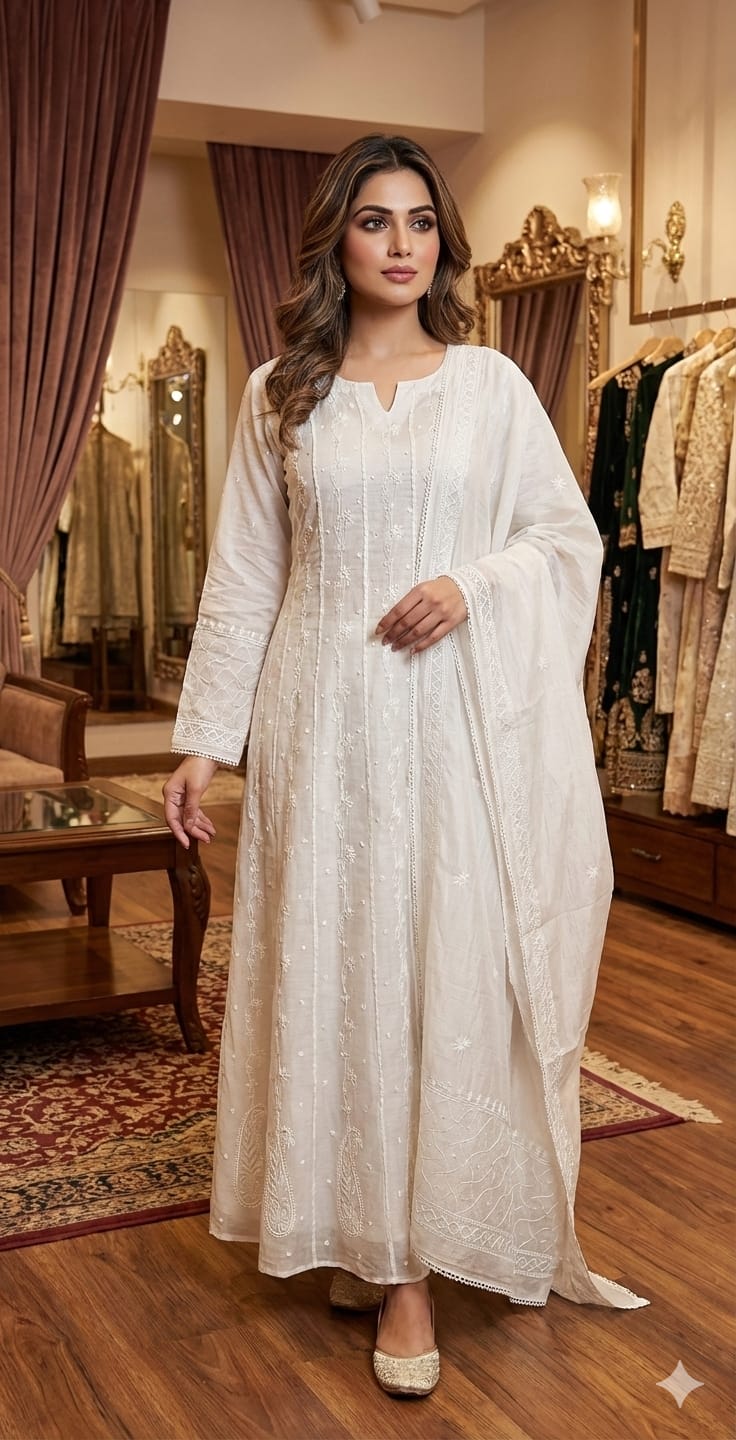 Presenting a Silver Chikankari Anarkali on the royal fabric of tissue with beautiful and intricate chikankari embellished with Cut dana and sequence . It has paisley motifs on the body of the suit . Kalis highlighted with silver gota.