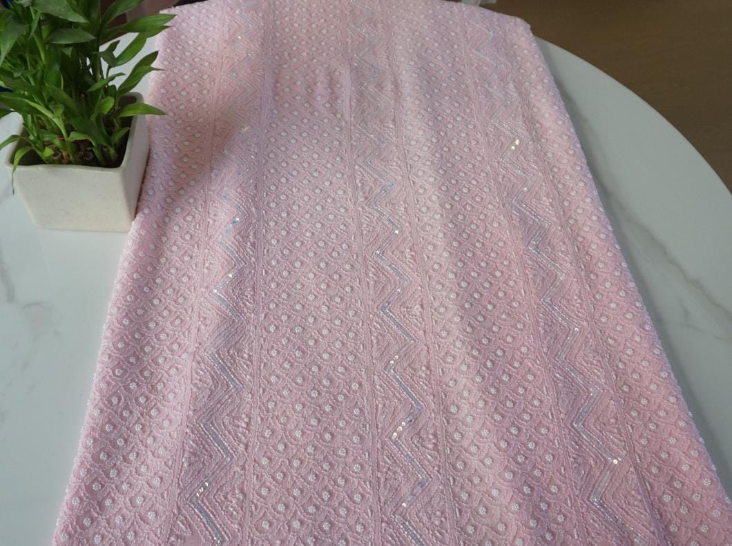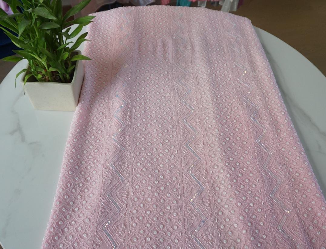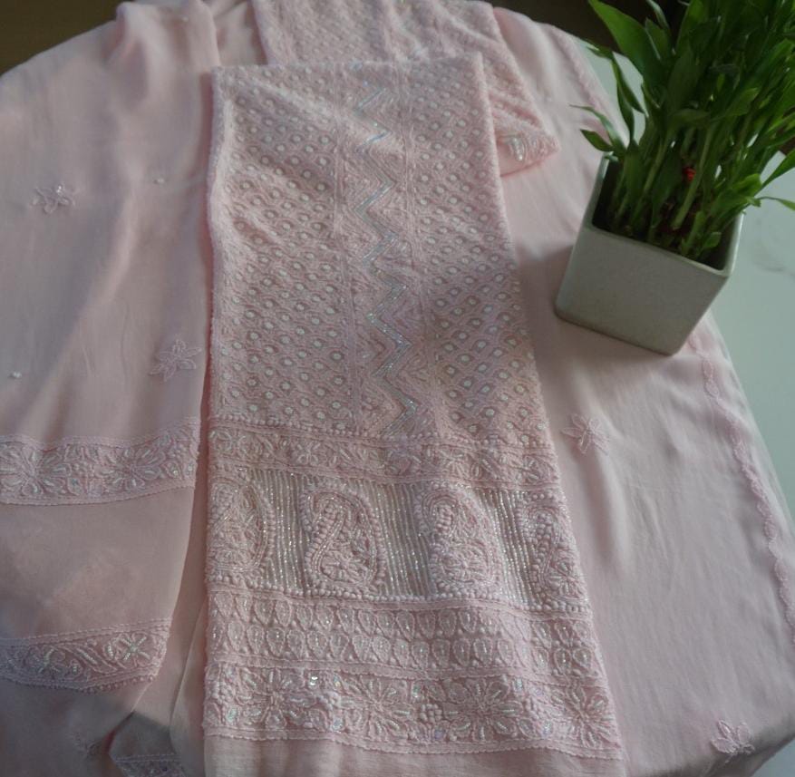 Timeless Elegance Crafted on Georgette Chikankari suit done in Pink shade . Ideal for the new brides . Beautiful Chikankari work is done along with Mukaish and Pitta work done on the royal fabric of Viscose georgette .
