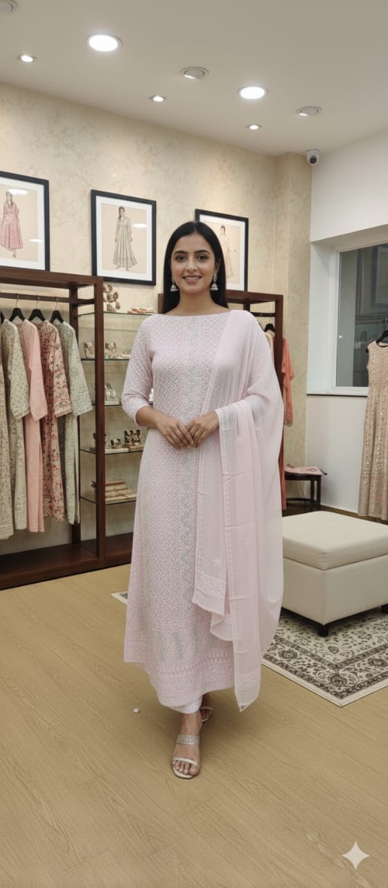 Timeless Elegance Crafted on Georgette Chikankari suit done in Pink shade . Ideal for the new brides . Beautiful Chikankari work is done along with Sequence , Cutdaana and Pearl work on the royal fabric of Viscose georgette .